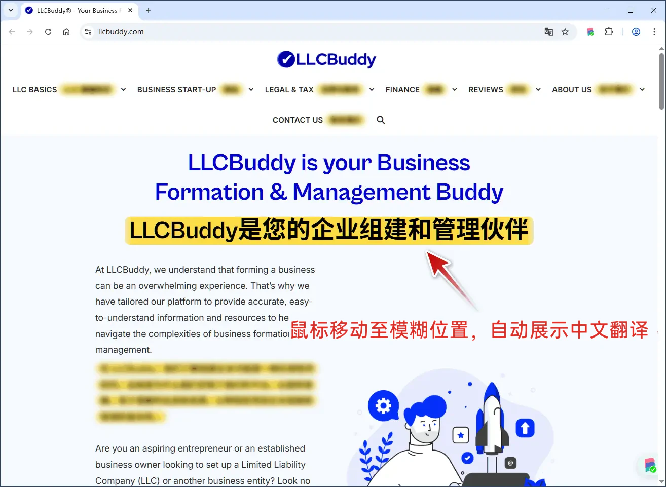 4、第三种模式(在英文下模糊化处理翻译的高亮中文,将鼠标移动至该模糊位置会自动显示出中文)