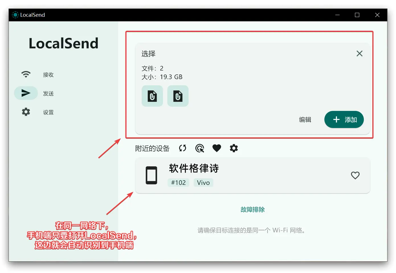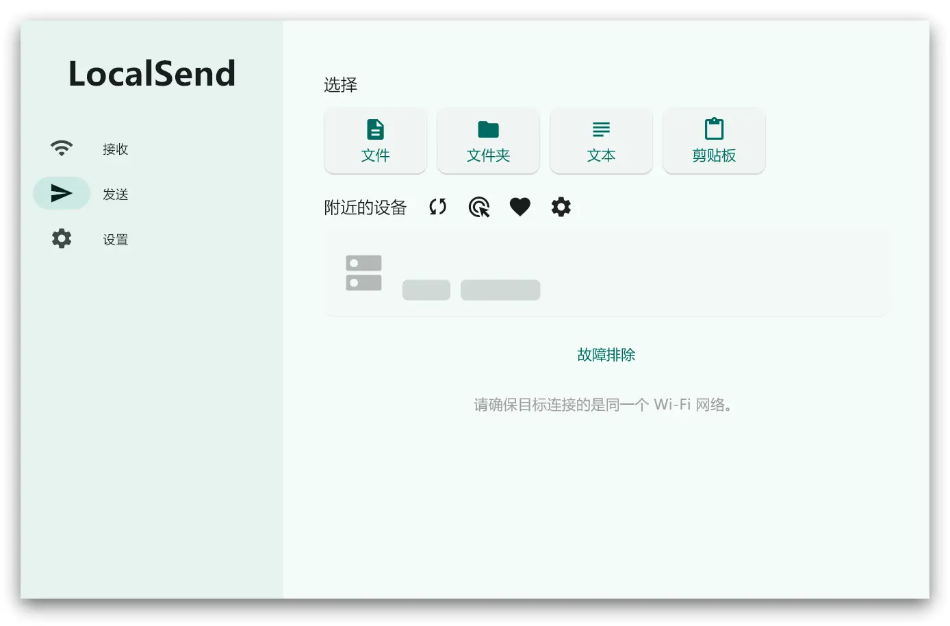 打开 App,附近有装了 LocalSend 的设备会自动显示出来。选中文件,点发送,对方点“接受”就行。全程不用输密码、不用扫码、不用加好友。 - 不仅能传文件,还能发文字