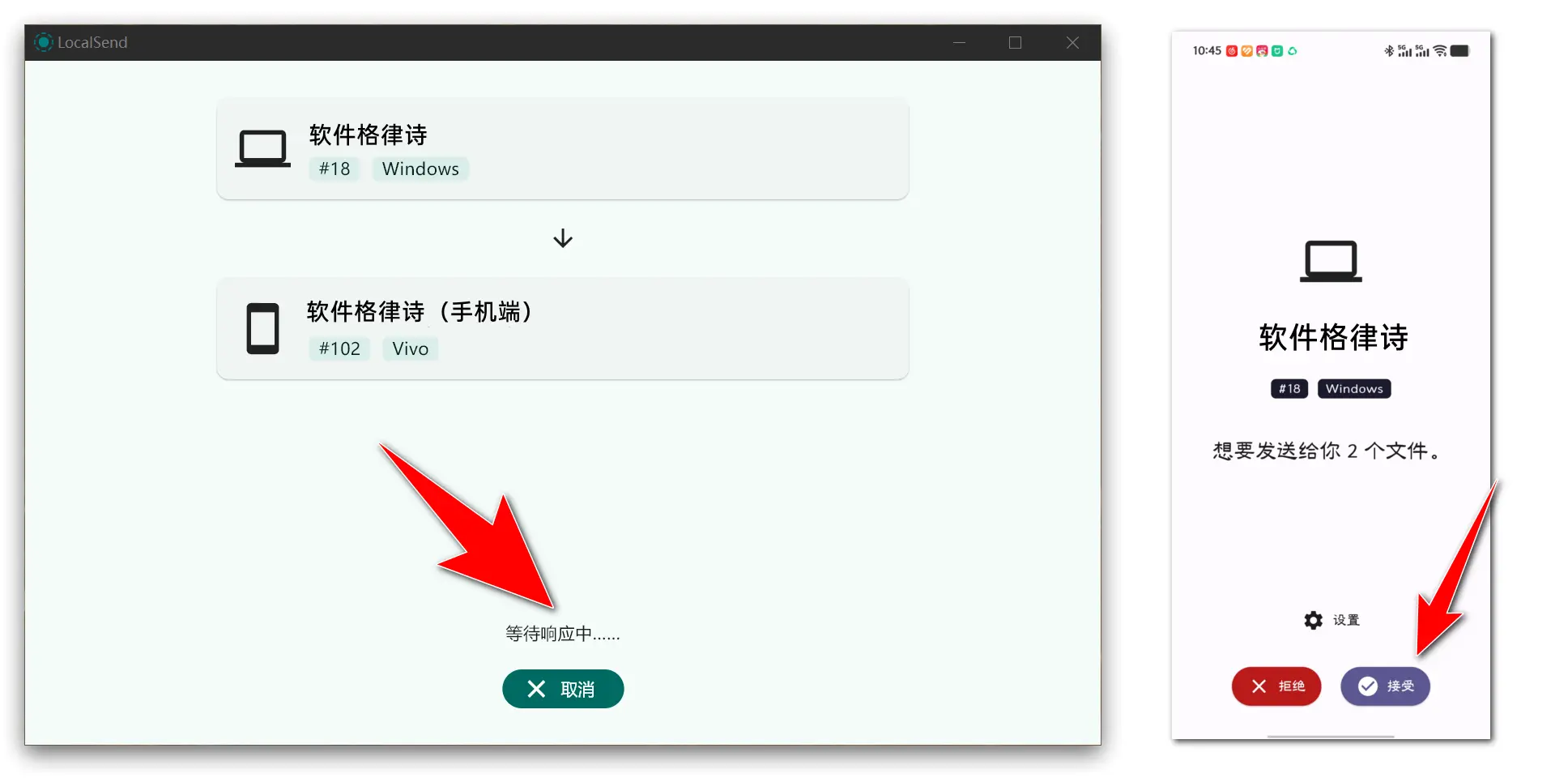 5、下图为手机端(等待接收)和PC端(等待响应中)的传送界面: