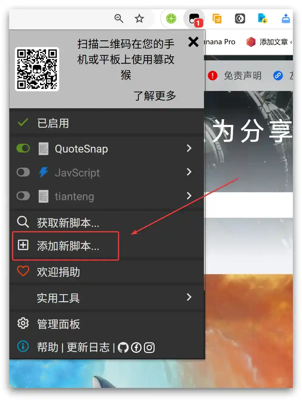 - 安装好 Tampermonkey(篡改猴)以后,如下图所示 – 鼠标左键点击图标 – 添加新脚本 – 拖拽下载的文件至该页面 – 安装即可