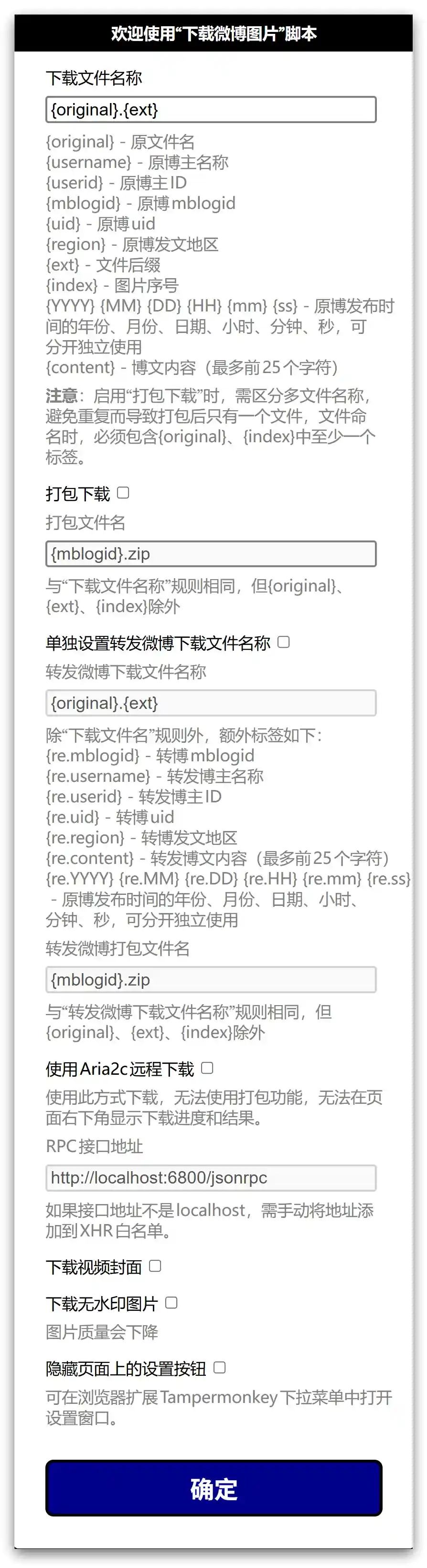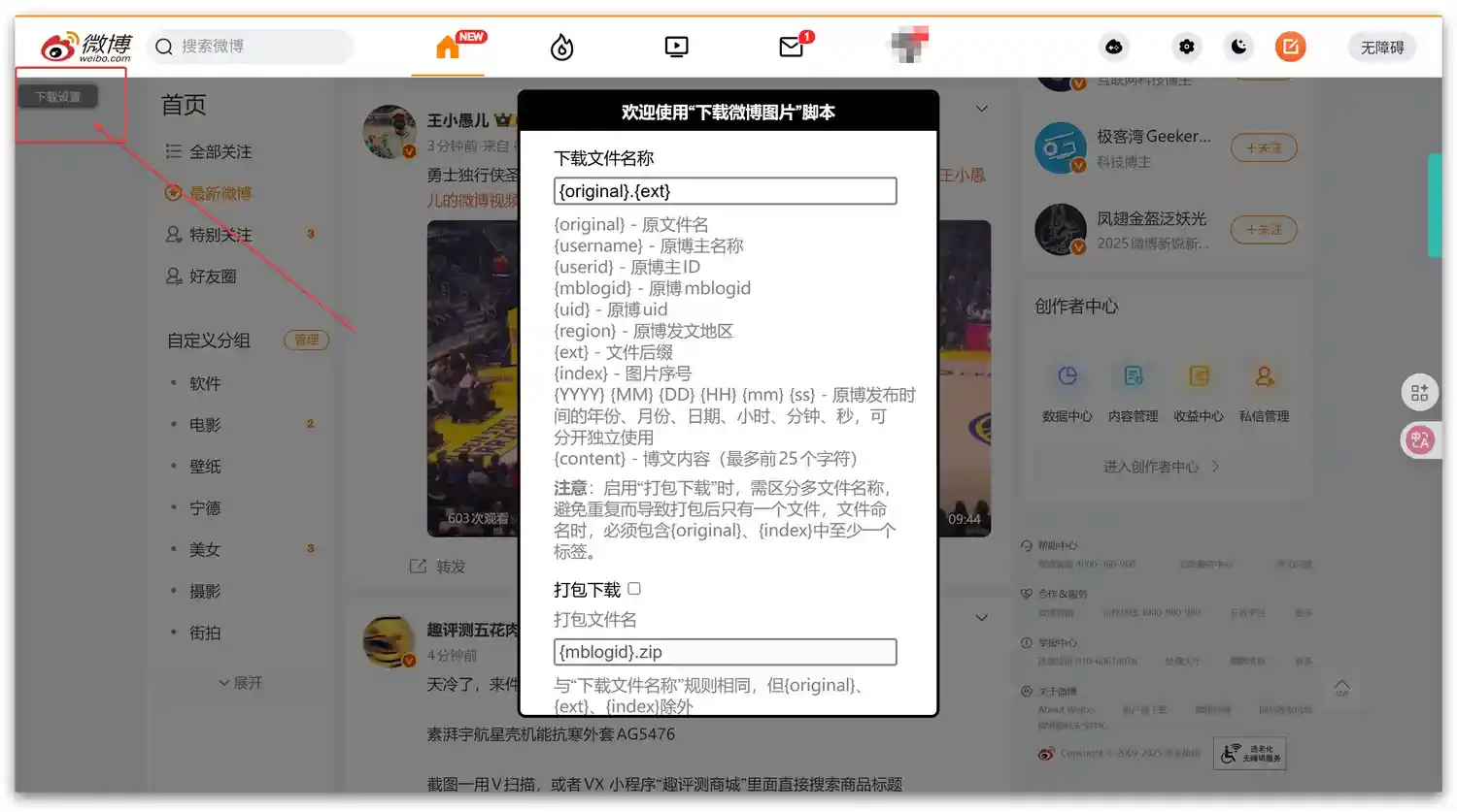 软件格律诗 是一个图片党,平常无论是手机还是网页刷微博都有一个习惯,看到好看的图片都喜欢下载下来做壁纸或者做收藏,网页端我使用的是今天给大家分享的浏览器拓展脚本 – Weibo一键下载 支持批量下载图片以及原清晰度视频文件,支持新版微博界面,可以自定义图片名称、打包下载也可以,你如果不喜欢水印图片也可以在设置里面去掉,傻瓜式操作,简直方便到不行!我们看下官方给的功能介绍: