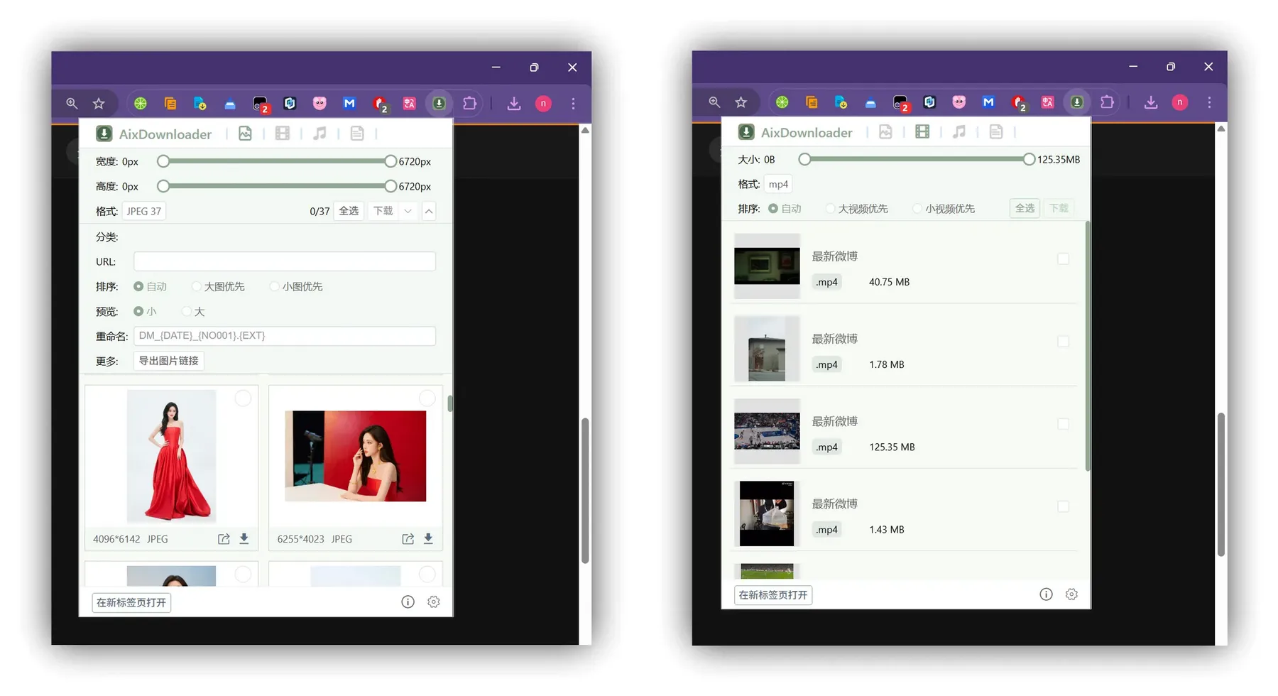 点击浏览器工具栏中的 AixDownloader 图标,扩展将自动扫描页面中的媒体资源。在弹出的面板中,可预览、筛选、重命名并批量下载所需内容。