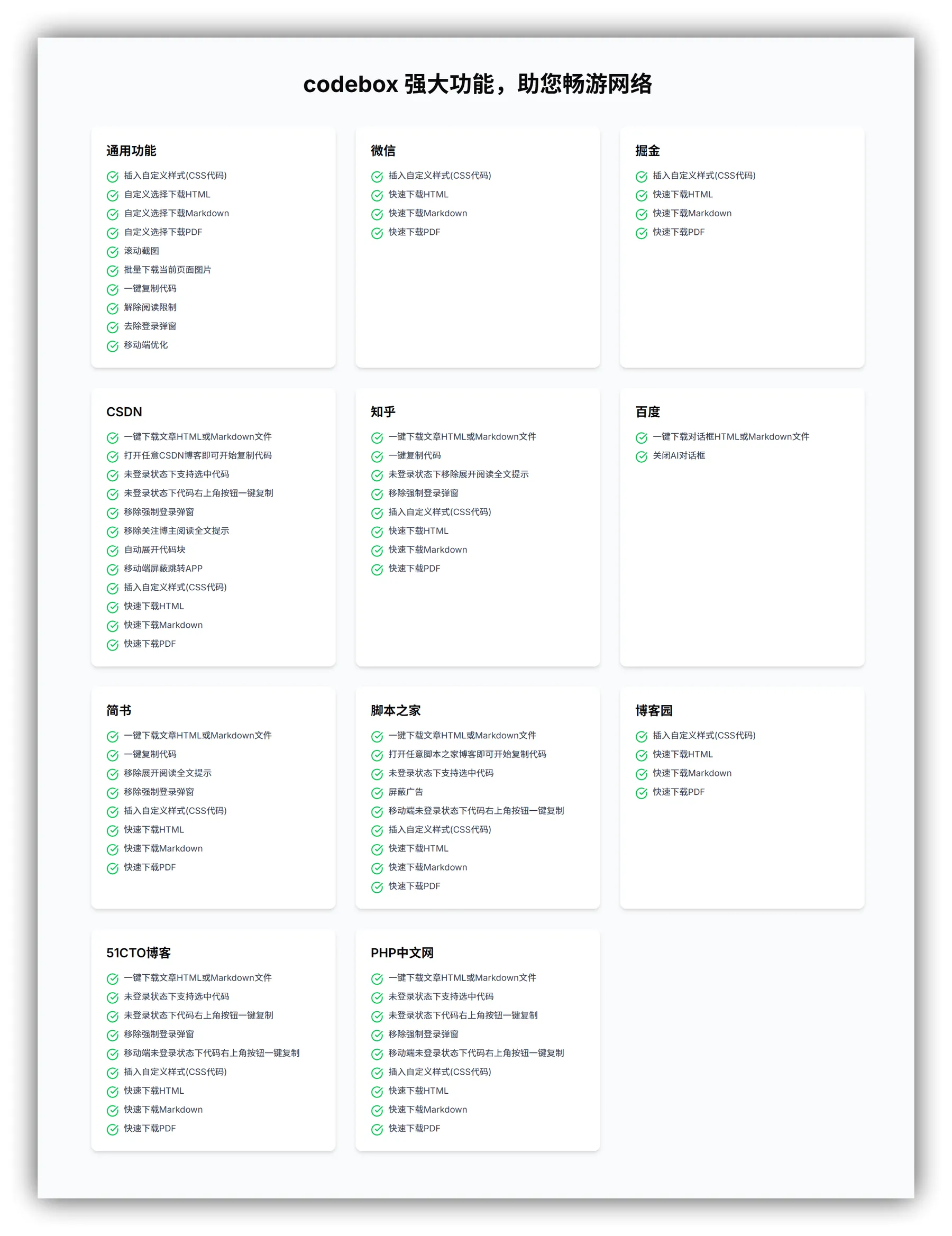 CodeBox 是一款面向技术用户与内容消费者的免费浏览器拓展,支持 Chrome、Edge、Firefox 及 360 安全浏览器等主流平台,解除主流中文技术网站的阅读限制、一键下载文章为多种格式(HTML/Markdown/PDF)、以及高效复制代码。通过智能识别页面结构与用户行为,能自动移除登录弹窗、展开全文、屏蔽跳转广告,并提供一键导出纯净内容的能力,显著提升信息获取与整理效率。