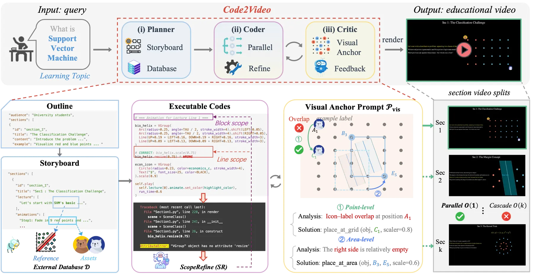 Code2Video 是一个由新加波国立大学 Show Lab 技术团队开发的基于智能体、以代码为中心的框架,能够根据知识点生成高质量的教学视频, 与基于像素空间的文生视频模型不同,利用可生成可执行的 Manim 代码来确保视频的清晰度、连贯性和可复现性。