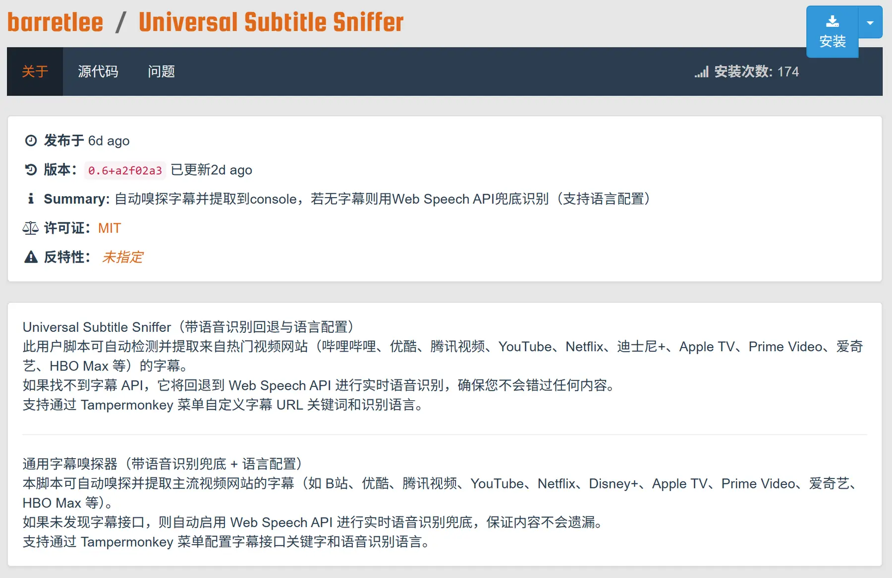 通用字幕嗅探器(带语音识别兜底 + 语言配置),本脚本可自动嗅探并提取主流视频网站的字幕(如 B站、优酷、腾讯视频、YouTube、Netflix、Disney+、Apple TV、Prime Video、爱奇艺、HBO Max 等)。