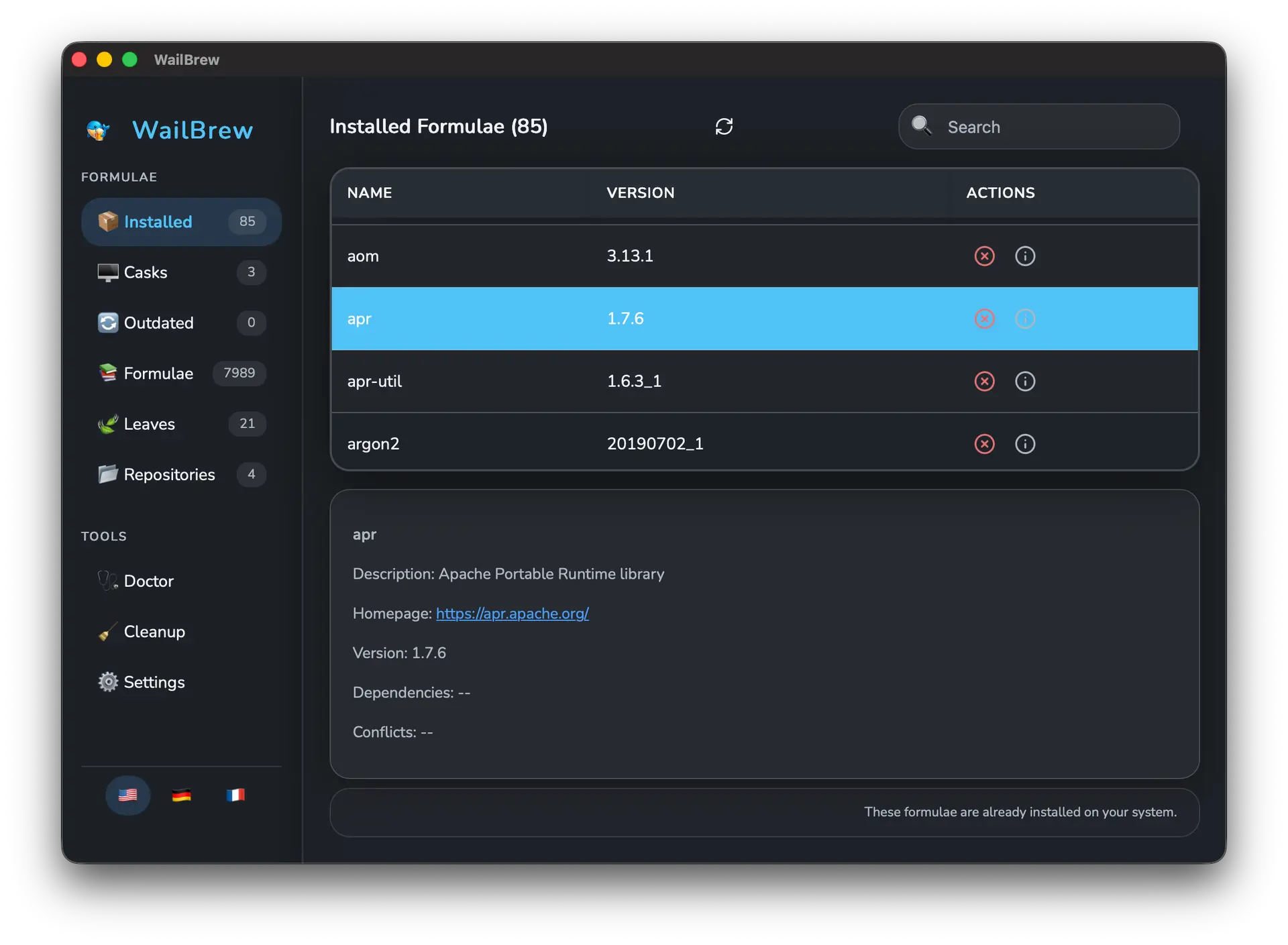 WailBrew 是一个极简且美观的 macOS Homebrew 包管理 GUI,通过直观、现代的界面体验命令行工具的强大功能。WailBrew 受 Cakebrew 启发,为 Homebrew 软件包管理带来了现代 UI 设计和增强功能。使用 Wails、Go 和 React 构建,它结合了原生性能和美观、响应式的界面。