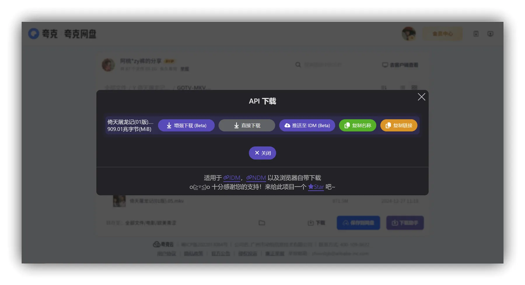 - 点击后弹出窗口显示直链,可选择复制、推送至下载器或直接下载。