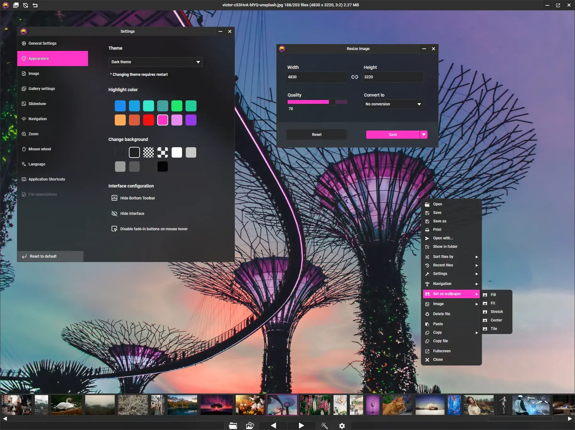 PicView 是一款开源免费无广告的功能强大的图片查看器,支持所有图片格式,支持打开的图片格式,包括 JPG、PNG、PSD、RAW、HEIC、SVG 以及动态 WEBP 和 GIF 等几十种。内置图片浏览模式,可以通过键盘快捷键上下切换查看图片。除此之外,还支持裁剪、批量转换、EXIF 编辑、压缩等实用功能,有了它不用再安装其它工具。