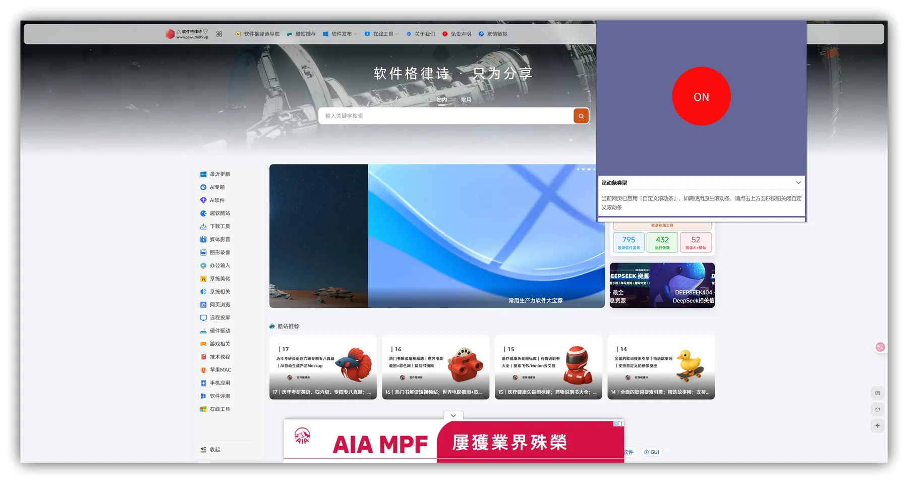 软件格律诗 在编辑文章的时候往往需要截图网页界面,对于审美有一些要求,发现网页右边的滚动条颜色和网页界面显示格格不入,于是花时间找到了 隐形滚动条 这款浏览器拓展,直接隐藏了网页滚动条,并且还支持点击网页最右侧或者左侧可以提供一些简单的快捷操作,比较简单的需求,有类似需要的童鞋不妨下载一试。