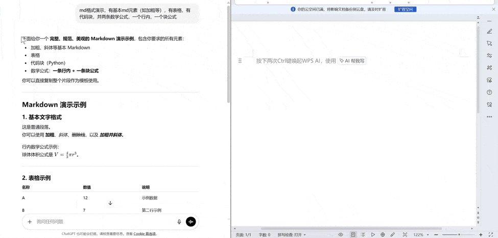 - 普通 Markdown / 网页内容 → 转为 DOCX 并插入到 Word/WPS。