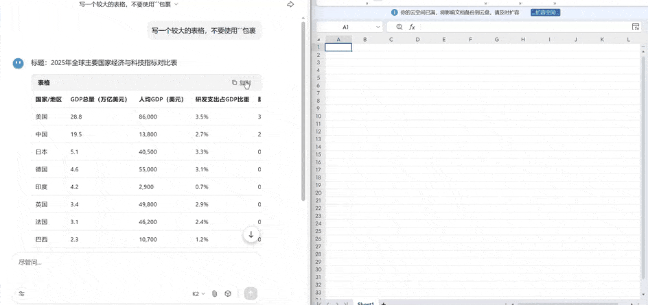 - Markdown 表格 → 若 Excel 已打开,则自动粘贴至 Excel;