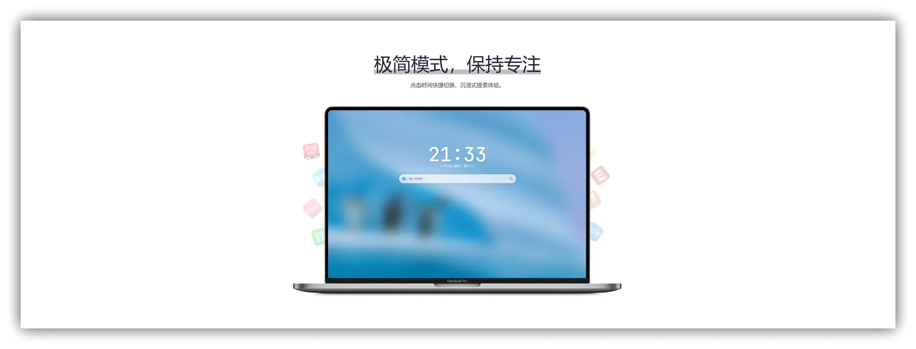 为满足专注型用户需求,提供“极简模式”:点击页面中央时间区域即可一键隐藏所有组件,仅保留搜索框与背景,营造类搜索引擎的纯净界面。配合支持 4K 分辨率的动态壁纸库(每日更新),用户既能享受视觉美感,又可在需要时快速回归高效工作状态。