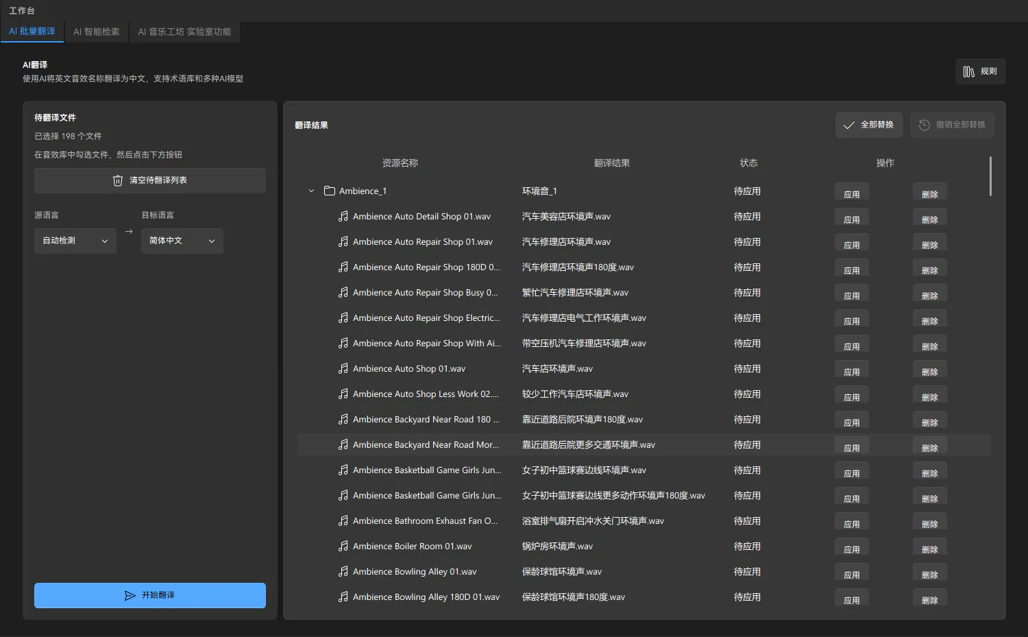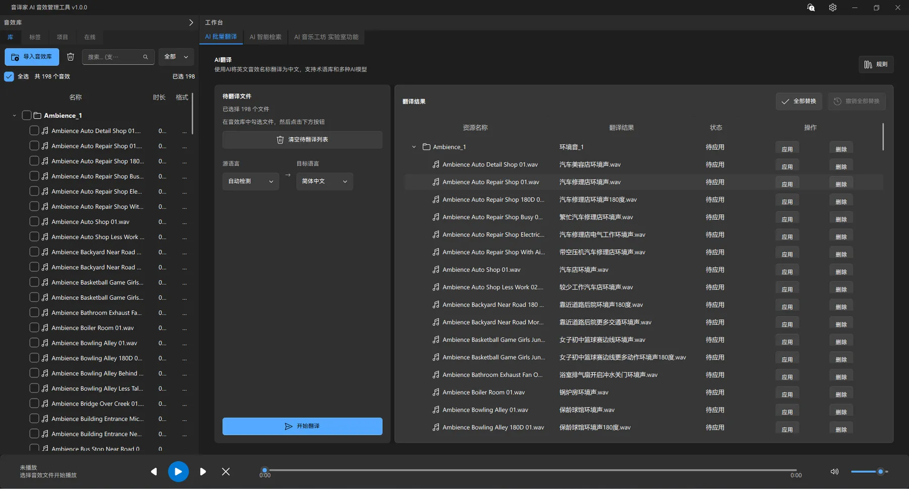 支持导入任意层级的音效文件夹,自动扫描并识别 WAV、FLAC、MP3、OGG、AIFF、M4A 等主流格式,以树形结构保留原始目录,内置音频播放器支持音量调节与试听。 - AI 批量翻译与重命名