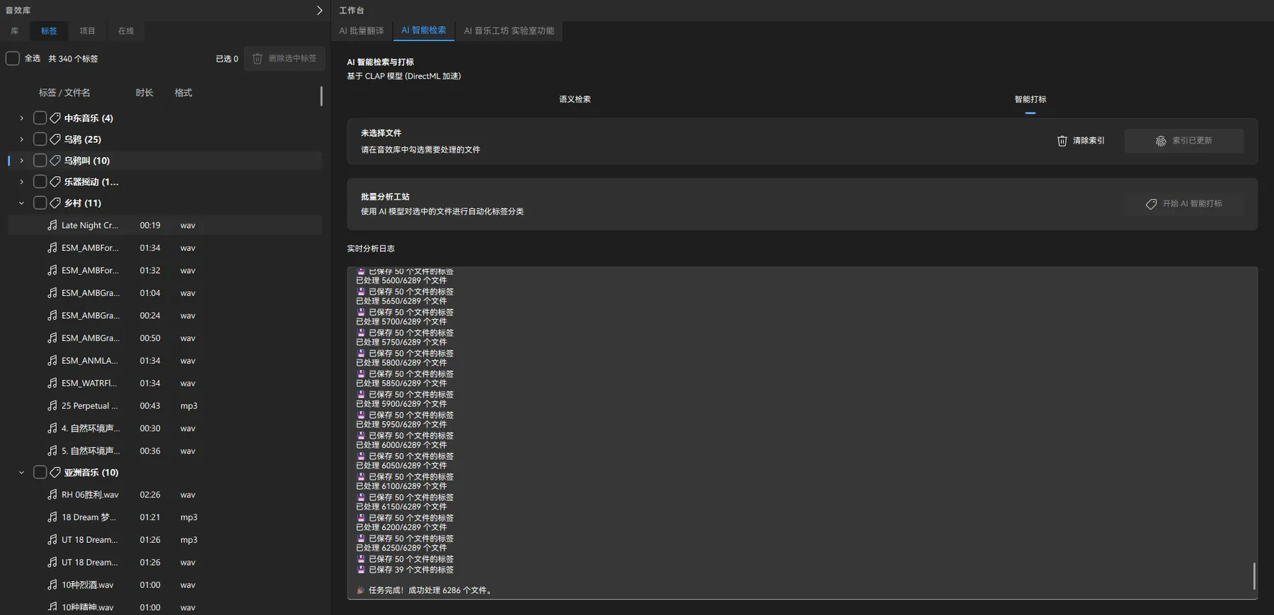 基于微软开源的 CLAP 音频-文本对比学习模型,用户可通过自然语言(如“金属碰撞声”“森林鸟鸣”)搜索本地音效库。支持 GPU 加速,建立数千文件索引的速度比 CPU 快 5–6 倍,索引结果持久化保存。 - AI 自动打标