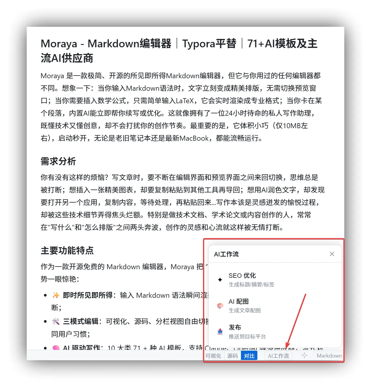 作为一款开源免费的 Markdown 编辑器,Moraya 把 “实用” 和 “轻盈” 平衡到极致,核心优势一眼惊艳: