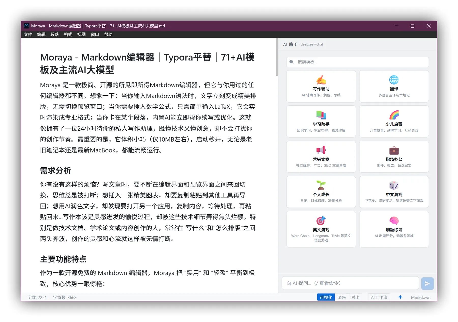 Cmd+/一键切换,满足不同用户习惯; - 🧠 AI 驱动写作:10 大类 71 + 种 AI 模板,支持 Claude、OpenAI 等多供应商,流式对话 + AI 图像生成,写作效率翻倍;