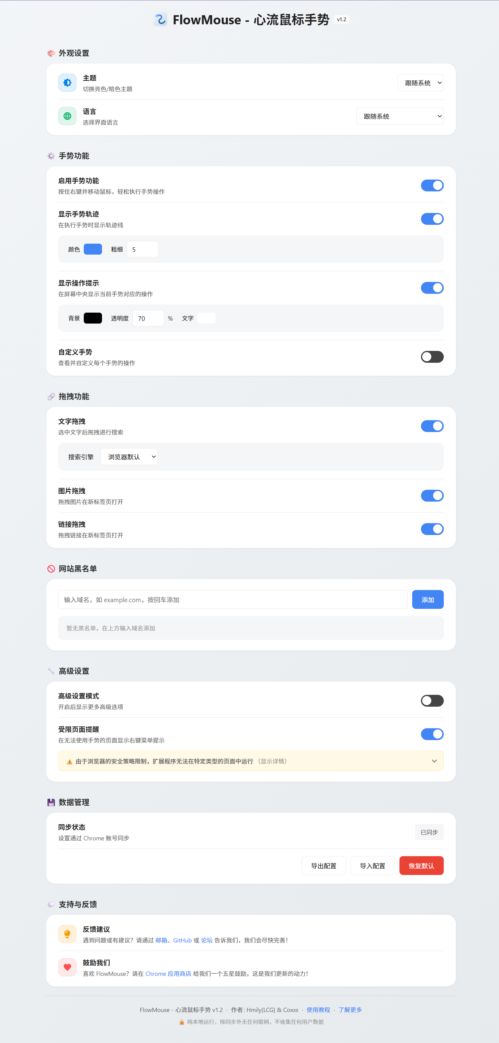 - 🔒 纯本地操作,隐私绝对可控:所有手势识别、拖拽处理均在本地完成,零网络请求、零数据收集、零信息上传,仅通过 Chrome 内置同步加密同步设置,彻底守护浏览隐私;