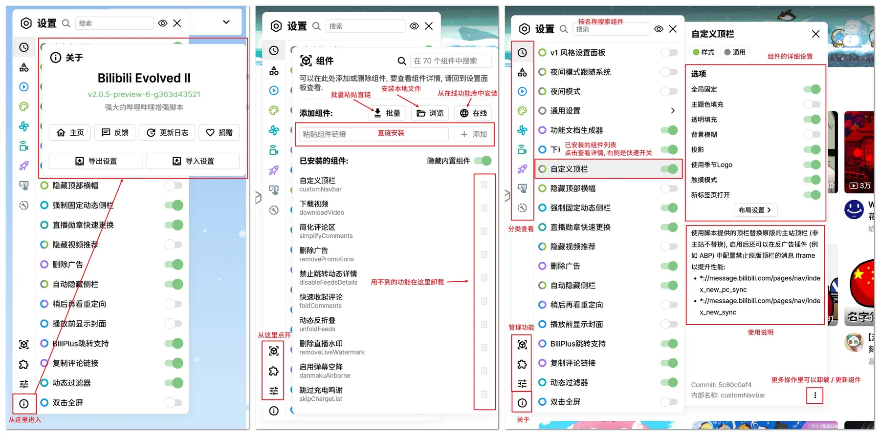 脚本启用后,在网页左侧中央会有功能面板和设置面板的入口,功能面板中包含适用于当前页面的一些功能入口,设置面板中可以管理组件的开启/关闭,修改组件选项, 以及安装/卸载组件和插件等。