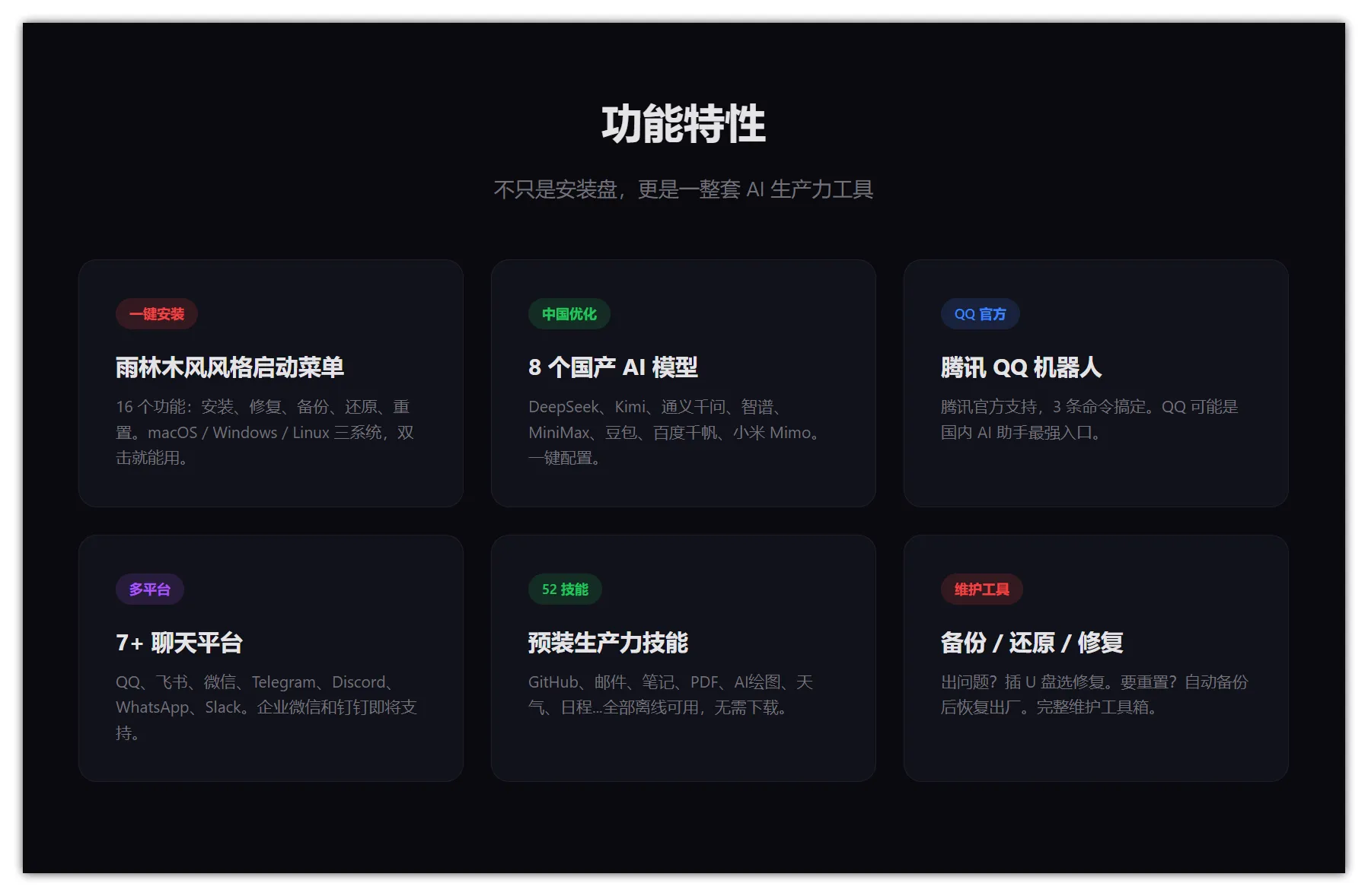 U-Claw 虾盘,可以看作是 OpenClaw 的离线安装 U盘,专为中国用户打造。一键安装,雨林木风风格。已经内置好了多个插件。