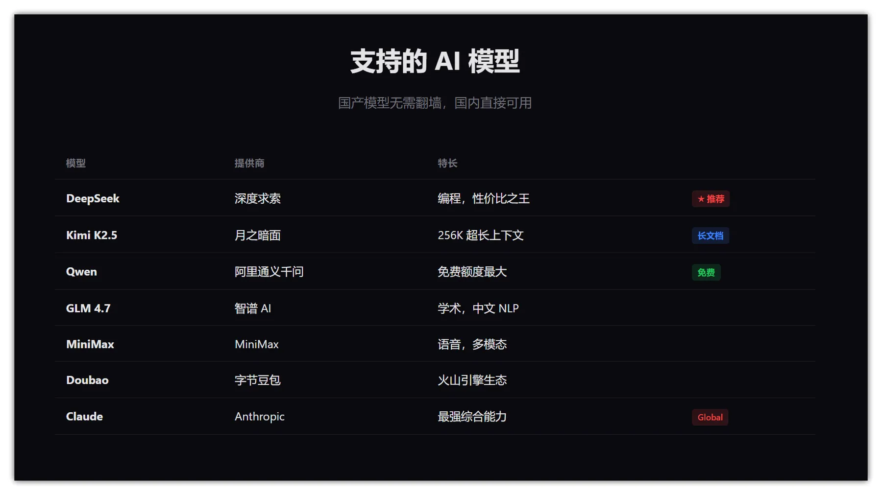 DeepSeek · Kimi · 通义千问 · 智谱GLM · MiniMax · 豆包