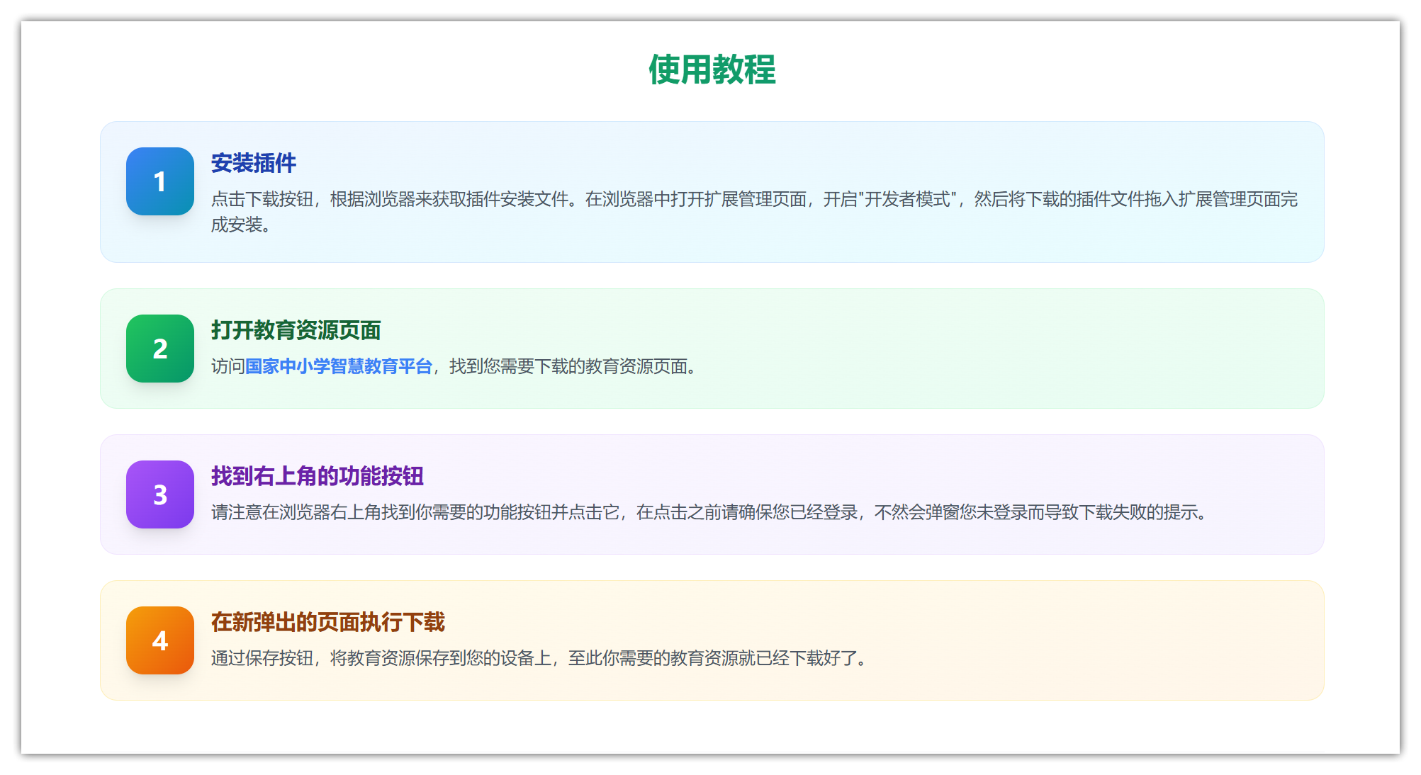 插件会自动检测更新并提示您安装。您也可以手动检查更新:在浏览器扩展管理页面找到”小源-电子教材下载助手”,点击”更新”按钮即可。建议保持插件为最新版本以获得最佳体验。