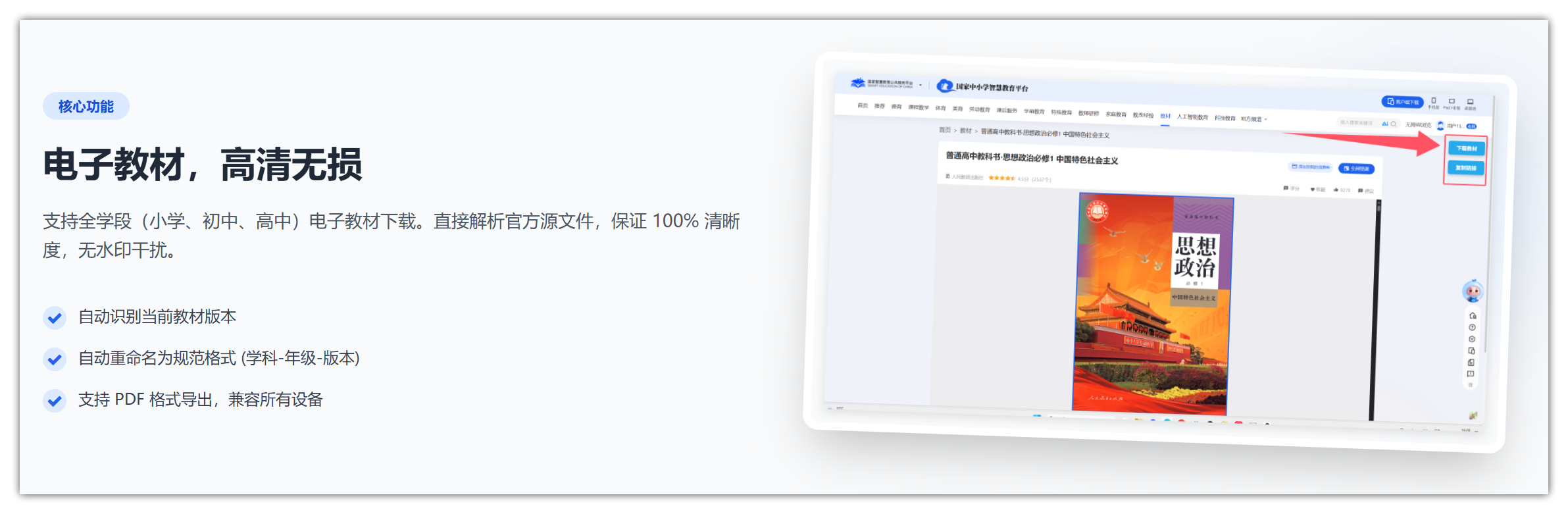 - 电子教材:小学、初中、高中全覆盖,直接解析官方高清源,100%清晰无水印,导出就是标准PDF,手机、平板、电脑都能看;