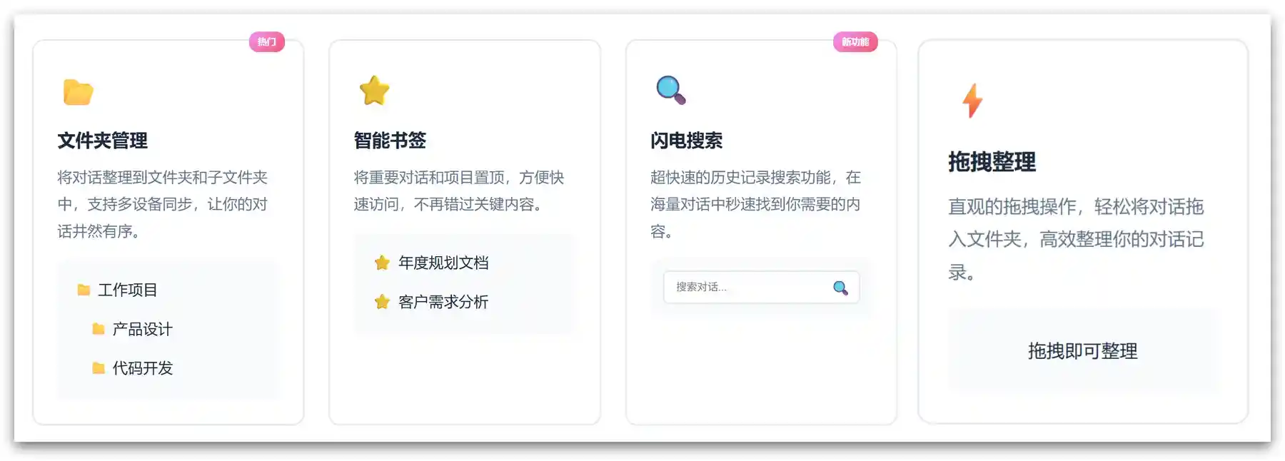 不想手动点选分类?直接拖拽对话到对应的文件夹就行,直观又简单,几秒钟就能整理完一堆对话。不用记复杂的操作步骤,纯纯的懒人友好设计,哪怕是电脑小白,也能轻松上手。