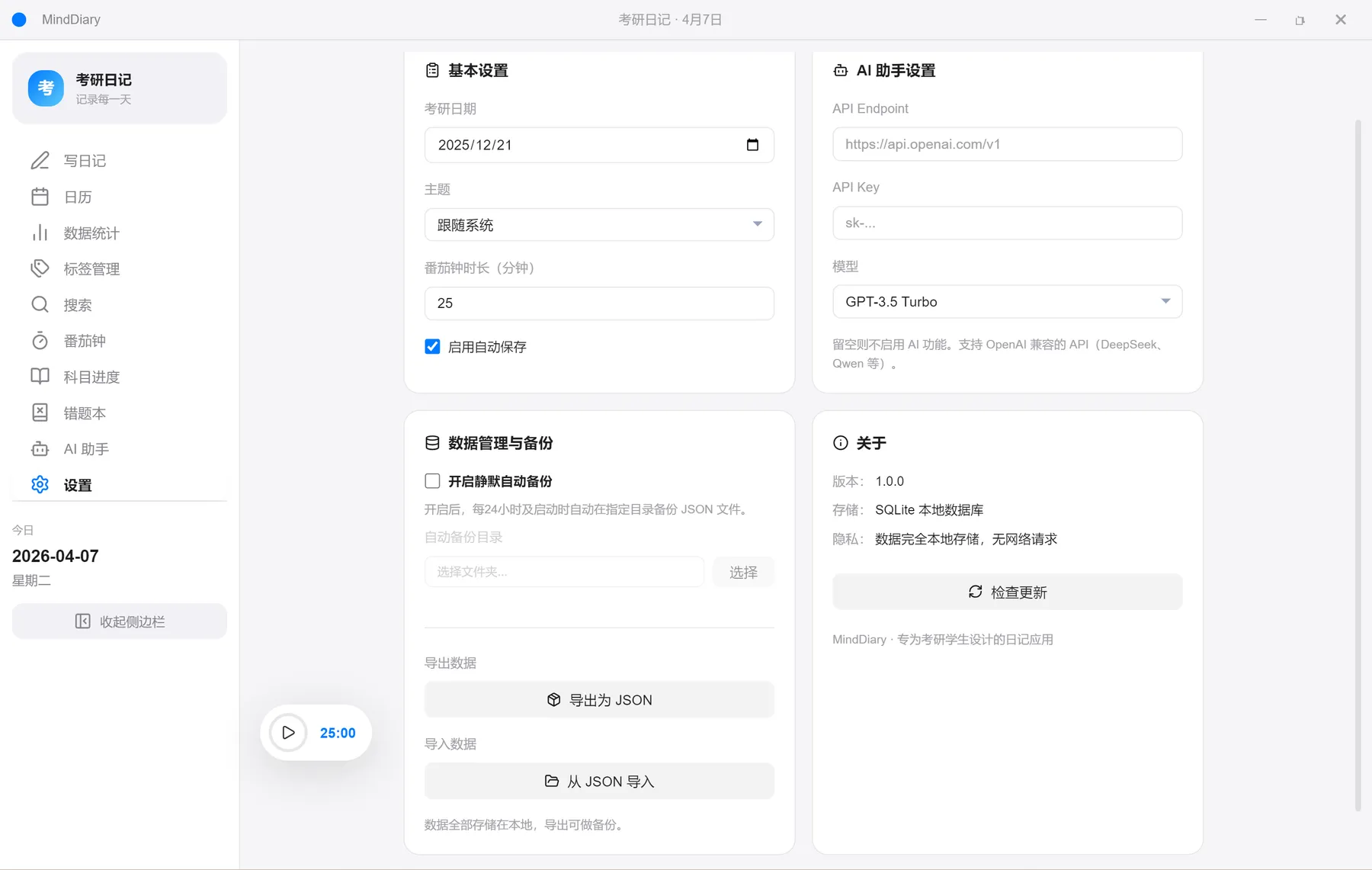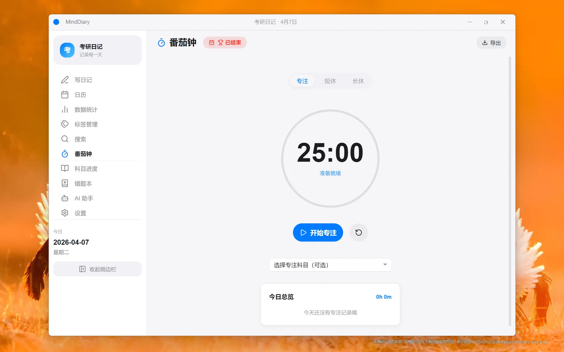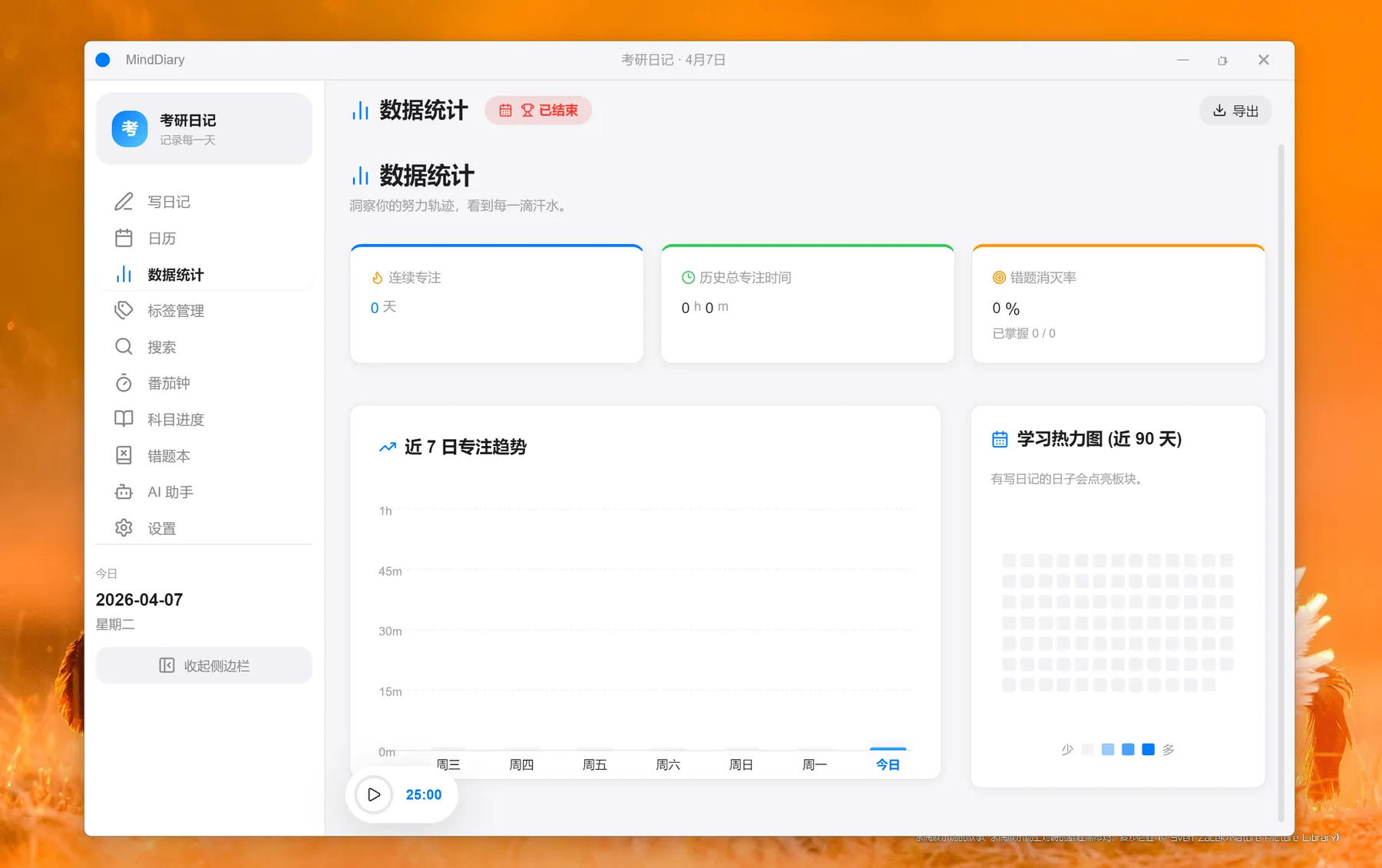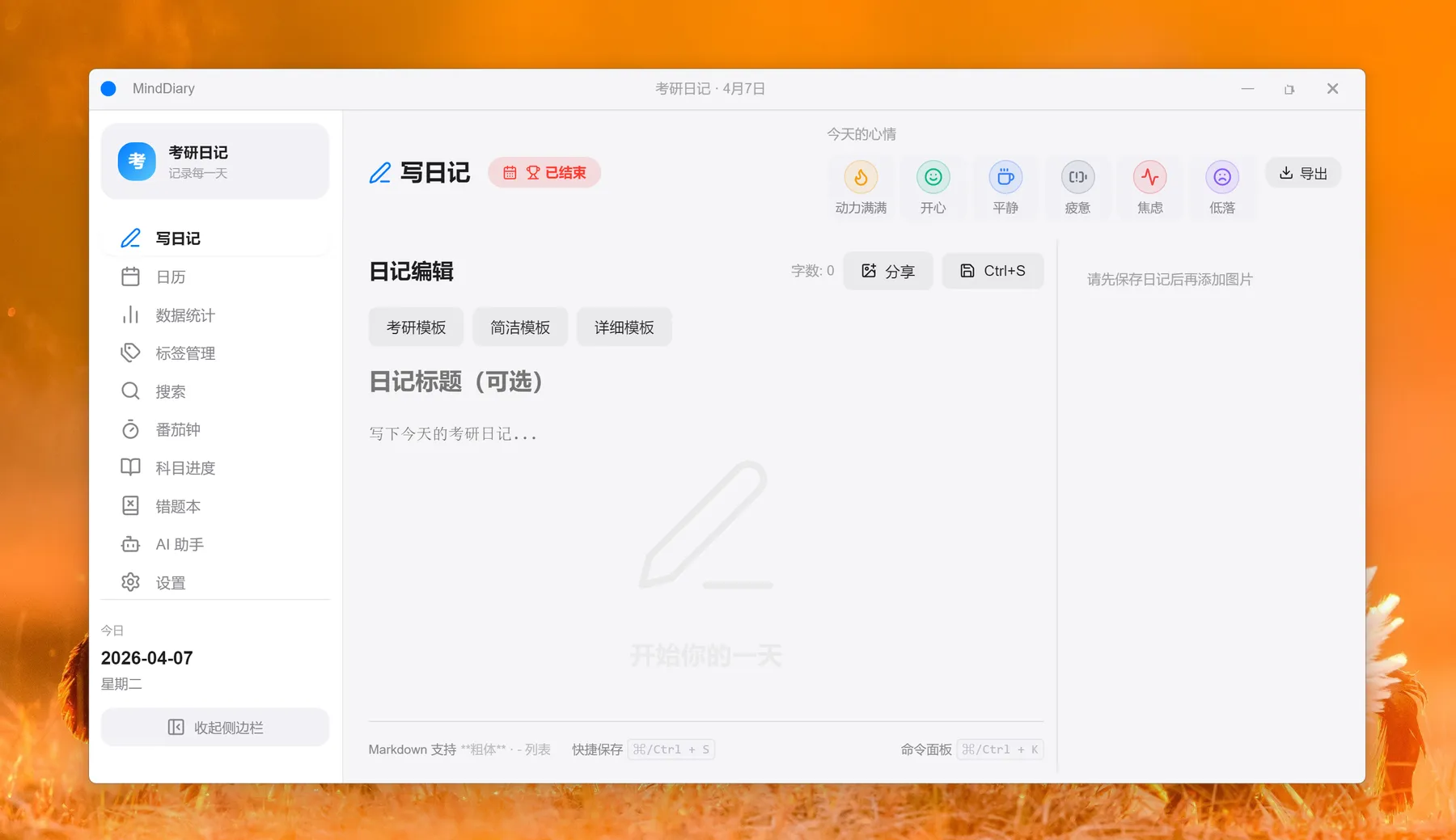 还在为考研备考手忙脚乱?日记记不清进度、番茄钟用着割裂、错题本乱糟糟堆成山,学了半天不知道效率在哪?今天 软件格律诗 给考研党挖到专属宝藏工具 – MindDiary考研日记,专为重度备考者打造的桌面级效率神器,开源免费、数据本地存,把学习记录、时间管理、错题复盘、AI助教全整合,备考全程一站式。