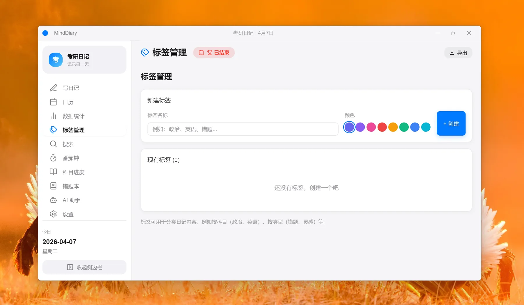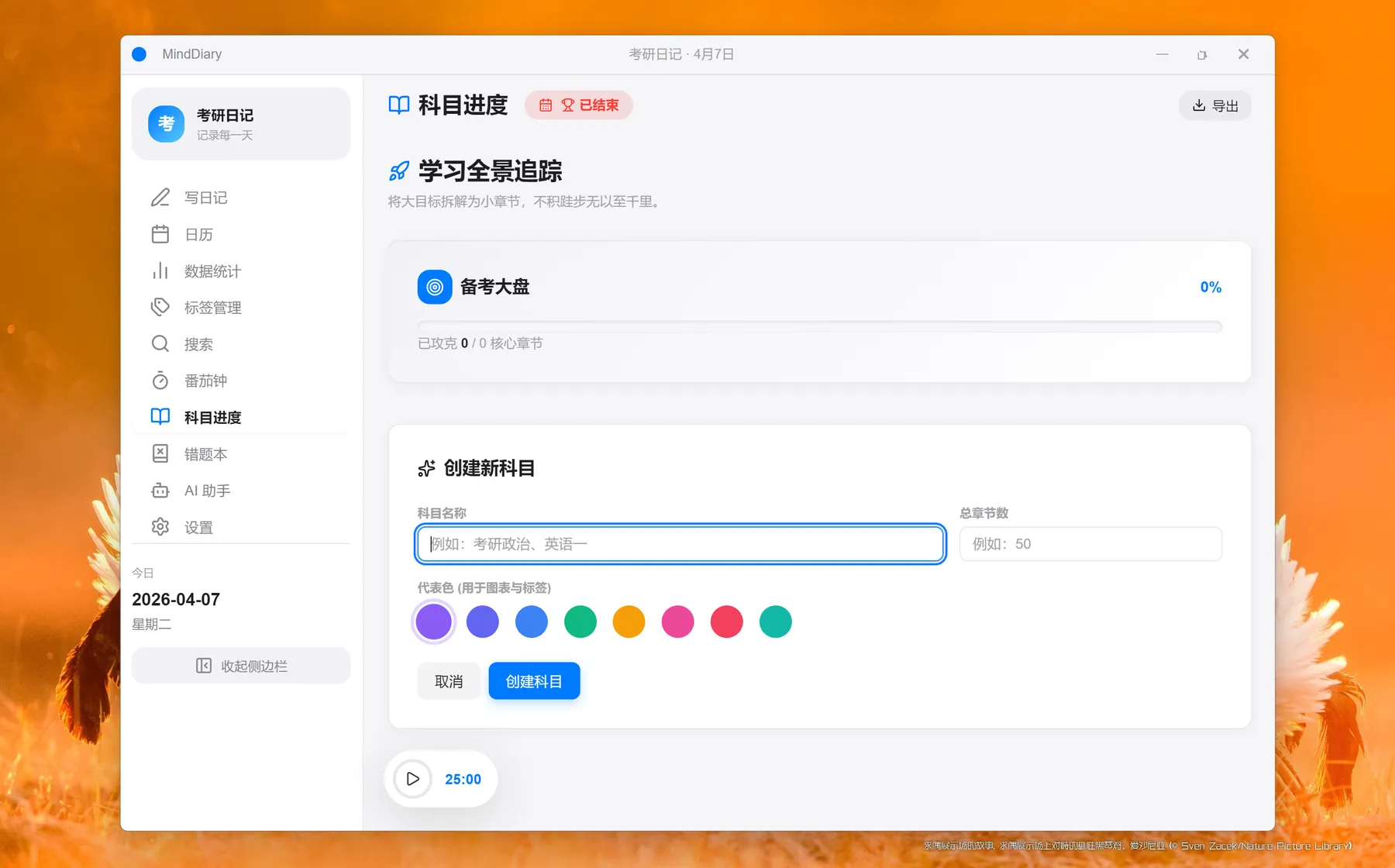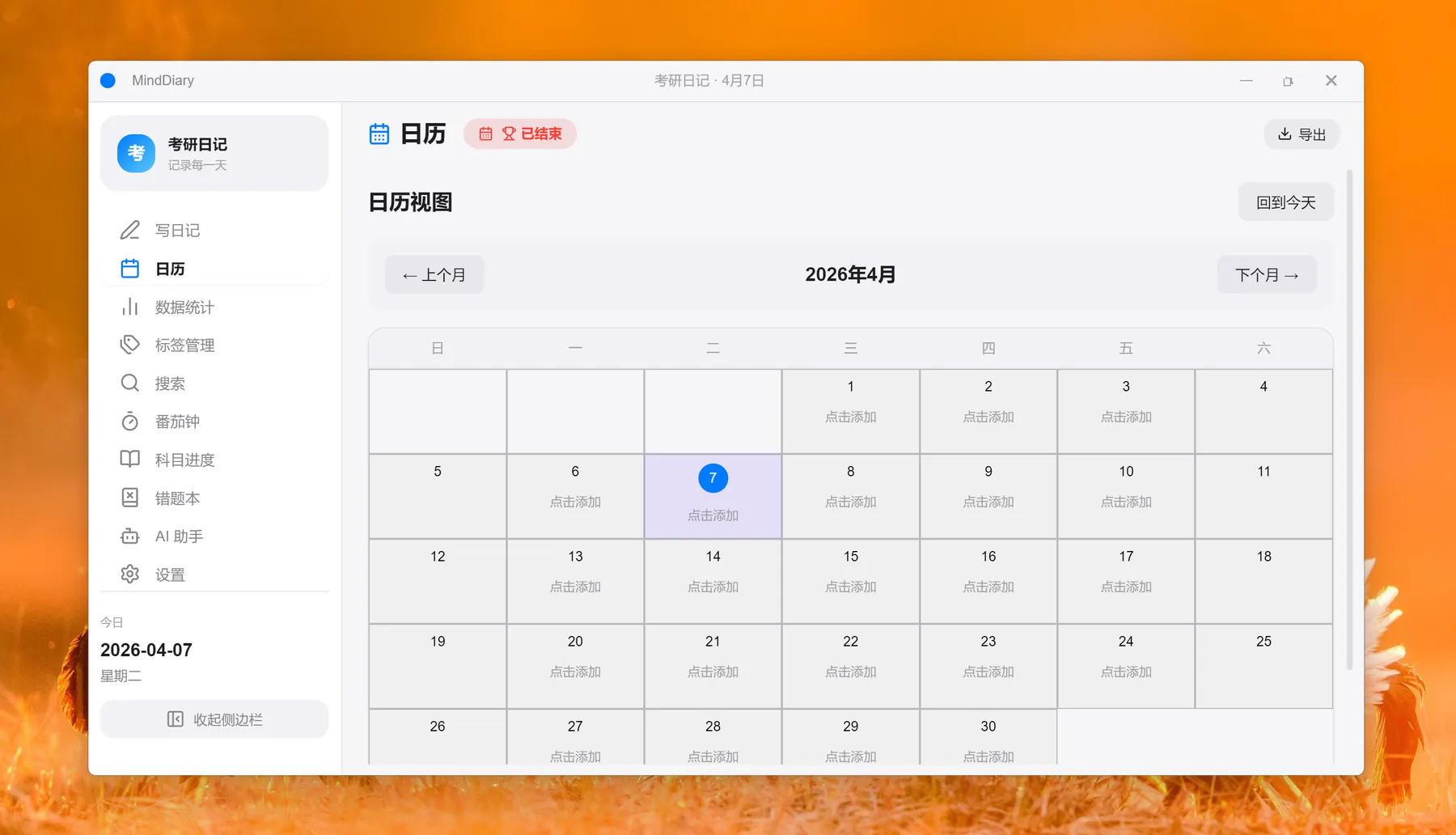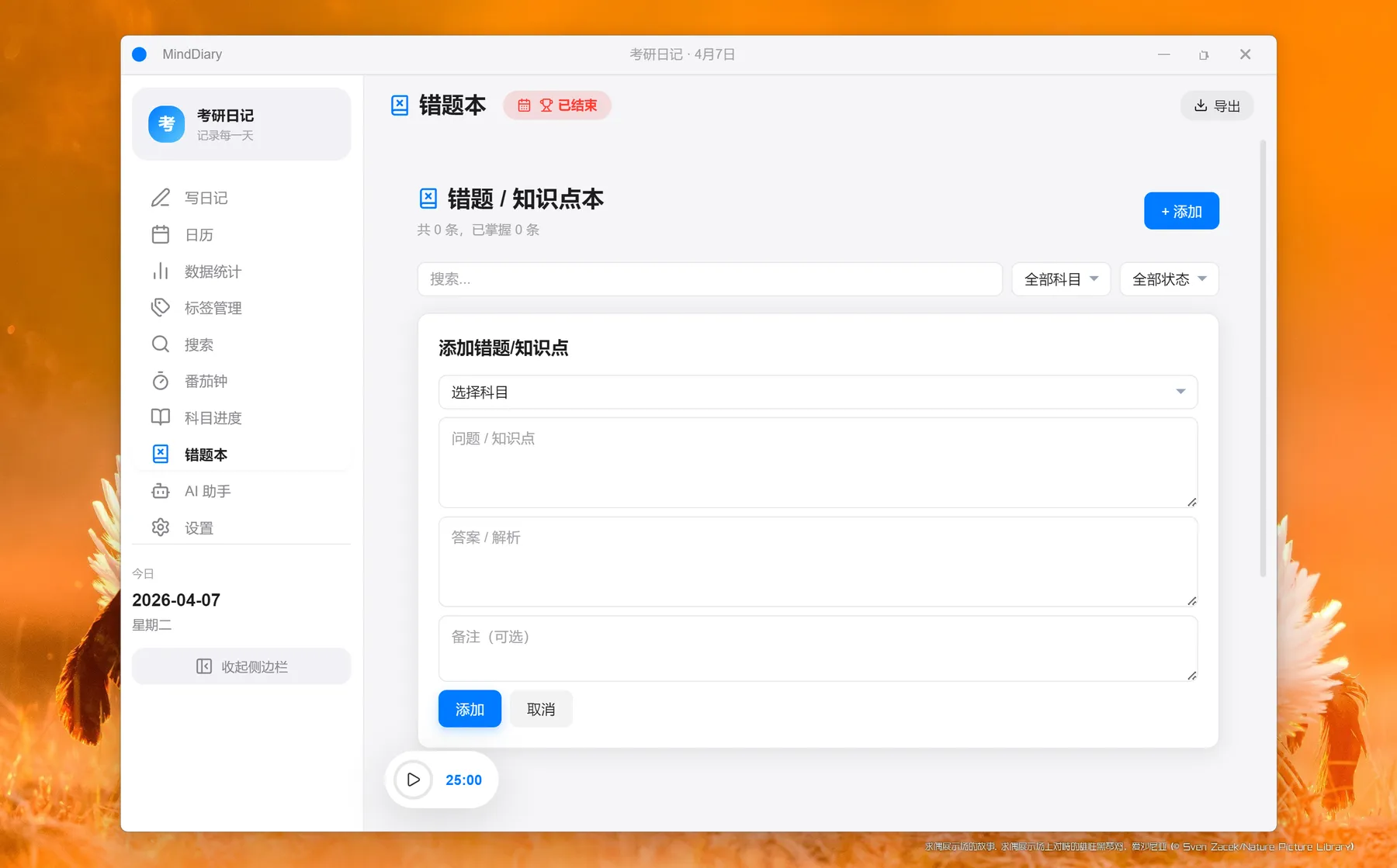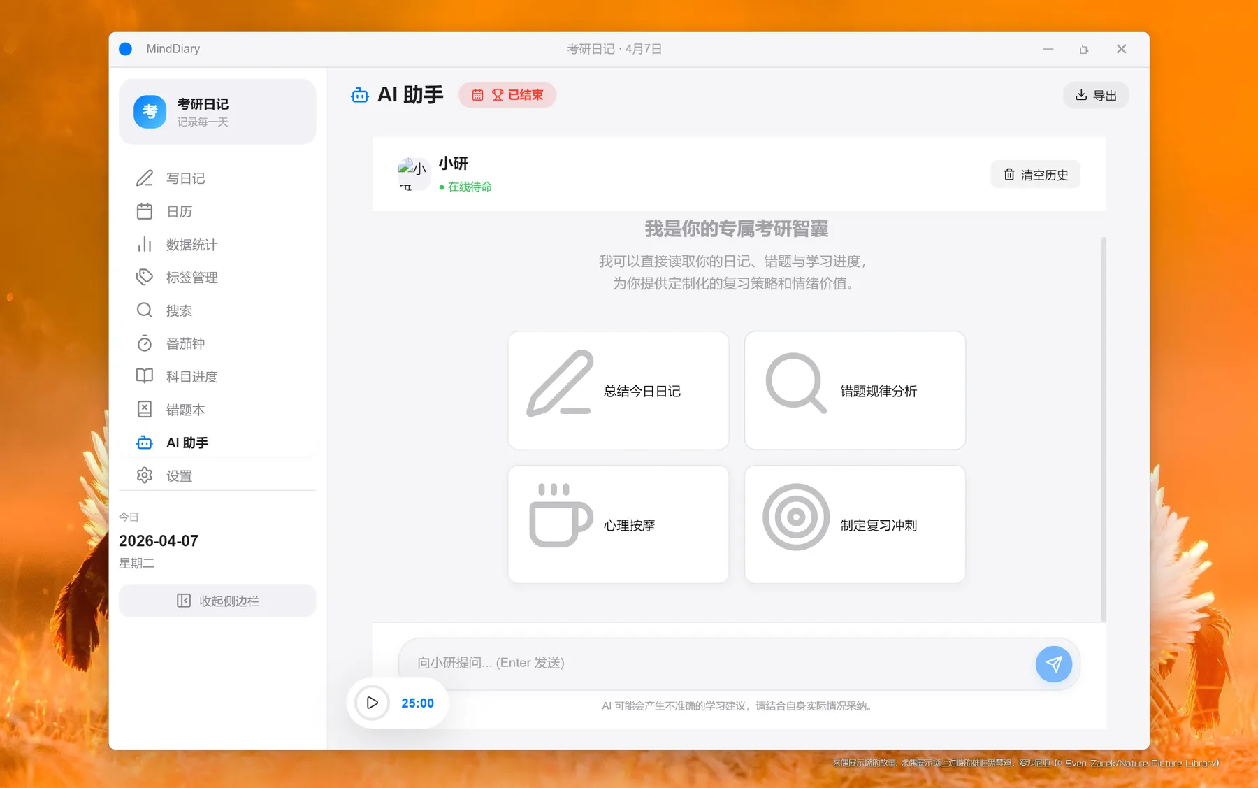 还在为考研备考手忙脚乱?日记记不清进度、番茄钟用着割裂、错题本乱糟糟堆成山,学了半天不知道效率在哪?今天 软件格律诗 给考研党挖到专属宝藏工具 – MindDiary考研日记,专为重度备考者打造的桌面级效率神器,开源免费、数据本地存,把学习记录、时间管理、错题复盘、AI助教全整合,备考全程一站式。