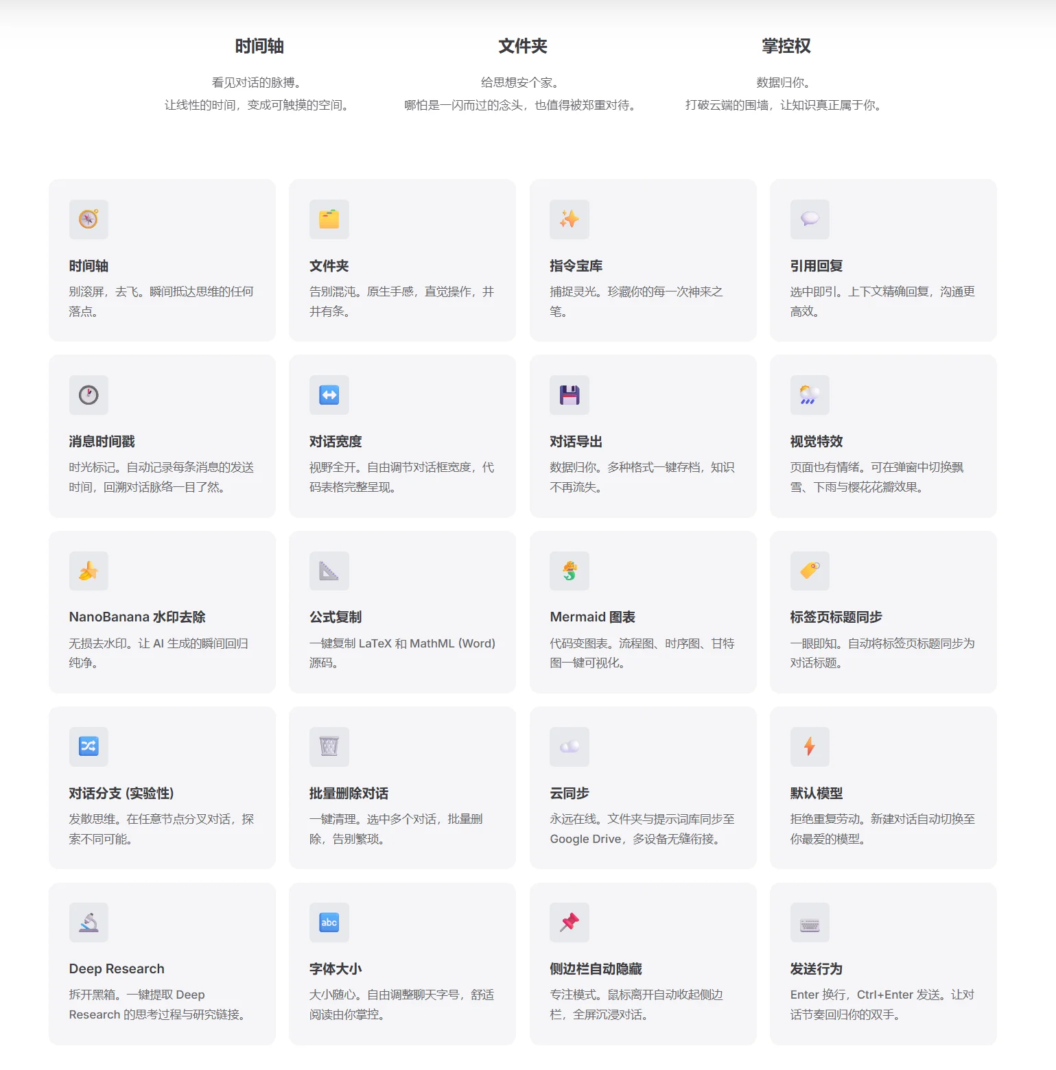 这款插件不搞花里胡哨的冗余功能,每一个设计都直击用户痛点:时间轴让对话跳转像“飞”一样快,文件夹让杂乱对话井井有条,灵感库珍藏每一个神来之笔,还有无损去水印、公式复制、聊天导出等实用功能,重新定义AI交互体验。