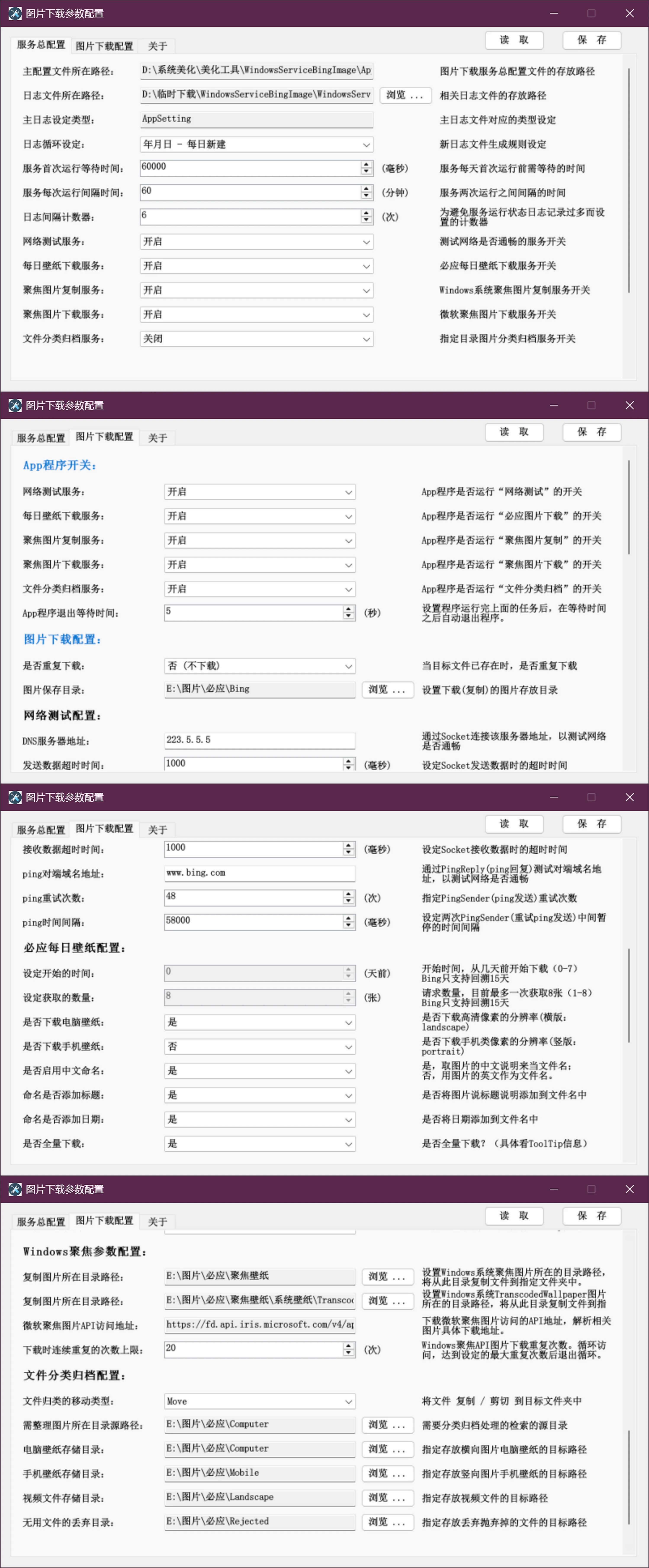 配置界面每个选项都配有文字解释,部分选项还有鼠标悬浮提示,清晰说明注意事项,比如设置壁纸保存目录(建议选非系统盘,避免占用系统空间)、开启/关闭某类图片下载、设置Windows聚焦图片循环获取次数等。配置完成后点击“保存”,配置文件自动生成,后续修改也方便。