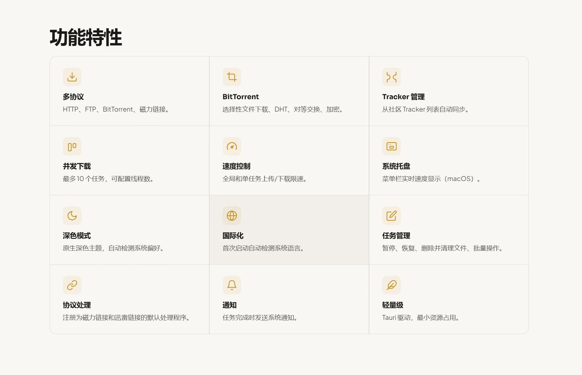 - BT 专属优化:选择性文件下载、DHT、PEX、加密传输