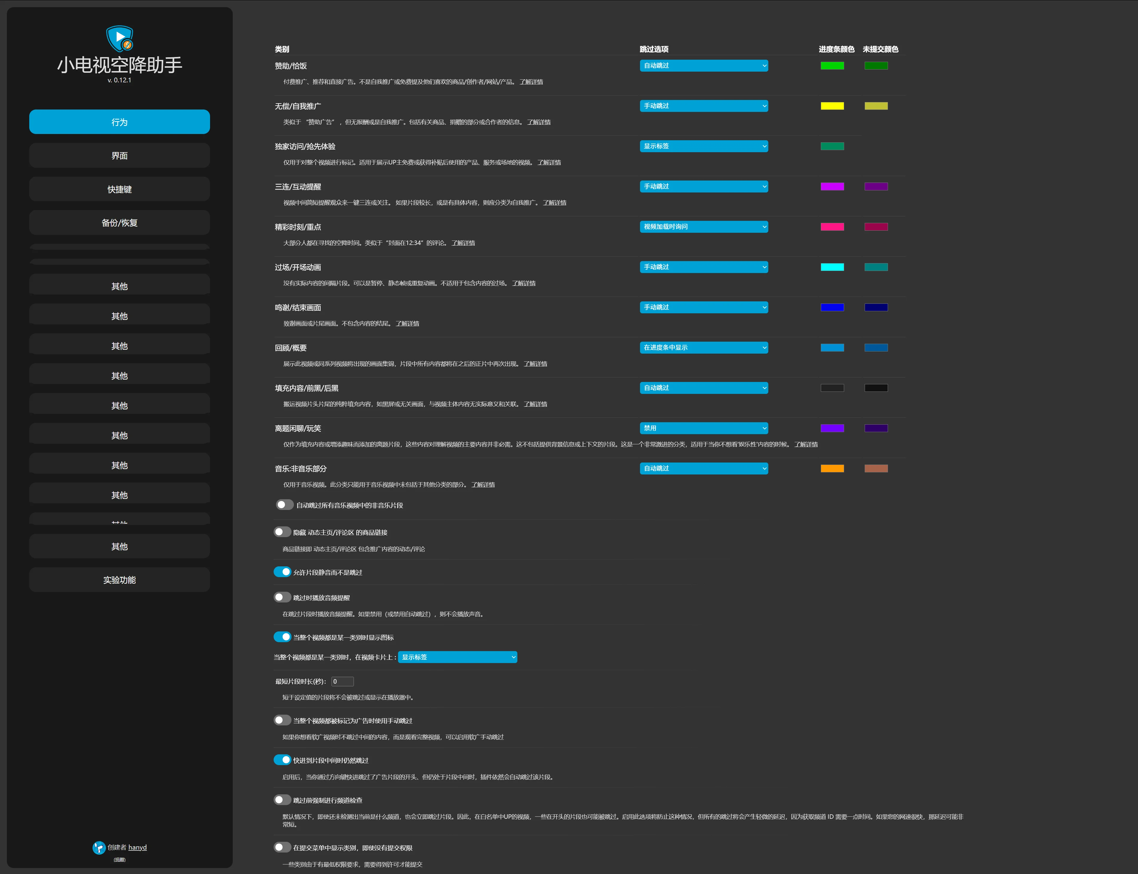 - 自由开关:广告、片头、三连、互动等分类