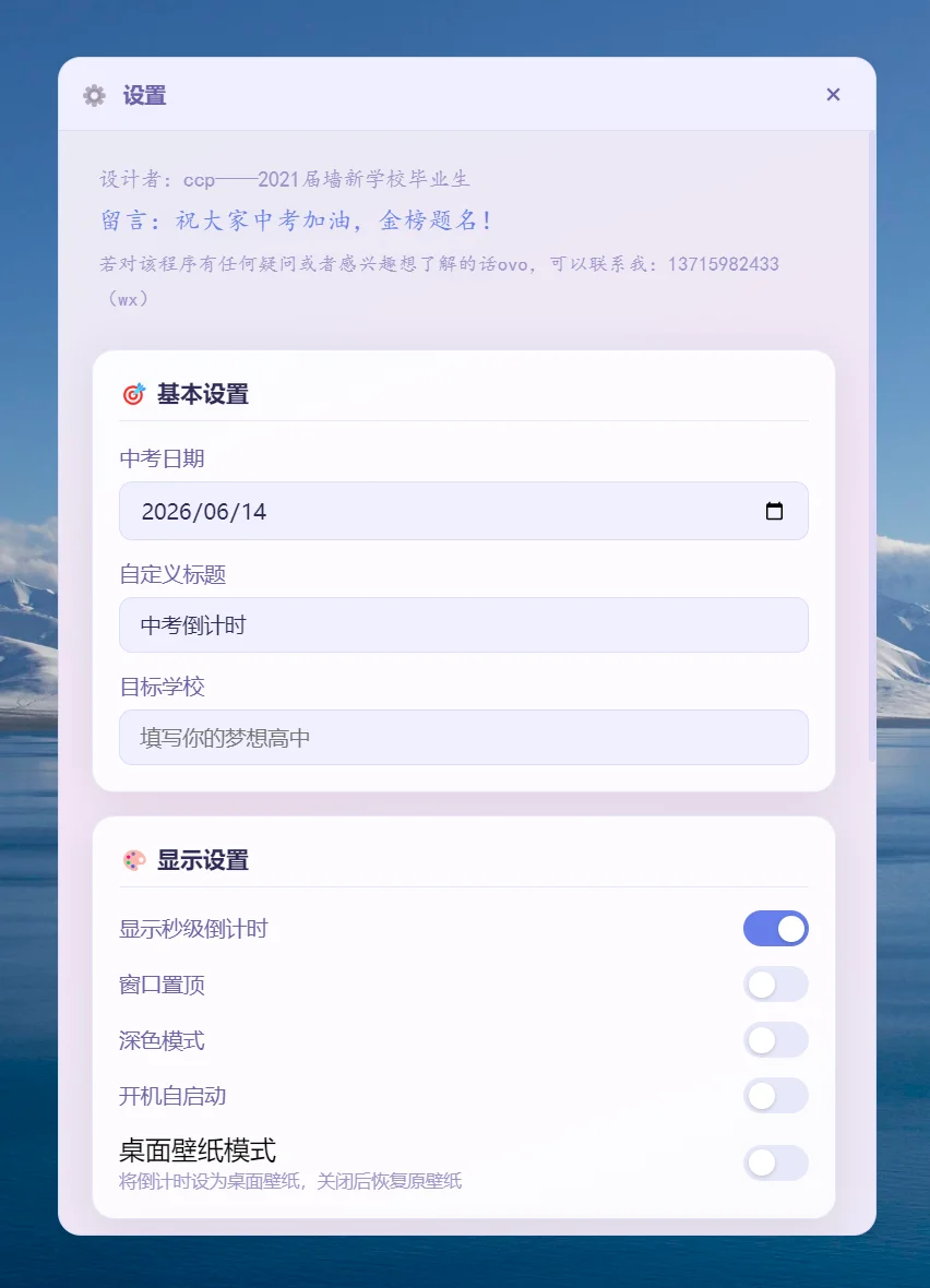 还在手动算中考剩余天数?还在为找不到高效倒计时工具烦恼?还在需要时刻提醒自己冲刺却总容易分心?这款专为中考考生量身打造的桌面倒计时,Electron 33强力加持,壁纸模式+多主题切换+每日励志名言,轻量流畅、操作简单,把中考倒计时刻在桌面,分秒提醒、步步督促,陪你全力以赴,冲刺梦想高中。