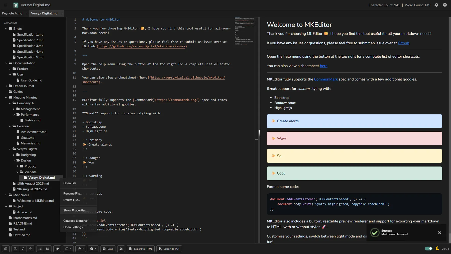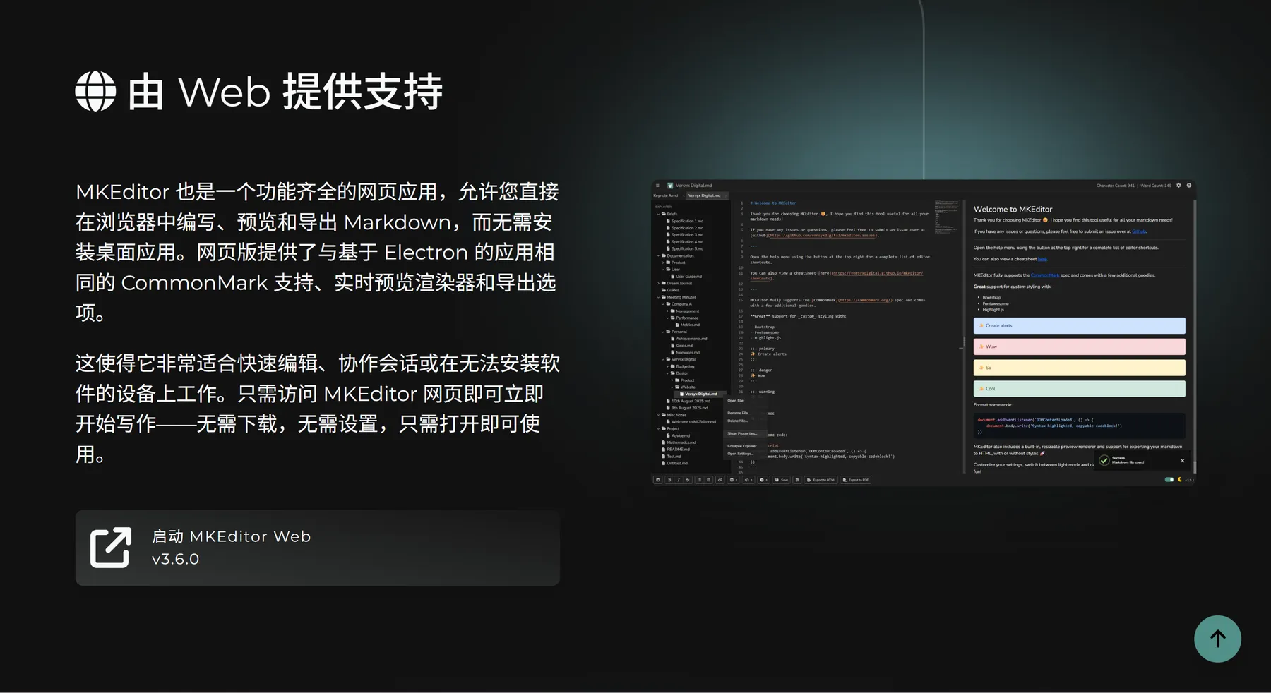 MKEditor 是一款主打样式美化的 Markdown 编辑器,完整支持 CommonMark 规范,自带丰富扩展功能,桌面版 + 网页版双端可用,全场景通用。