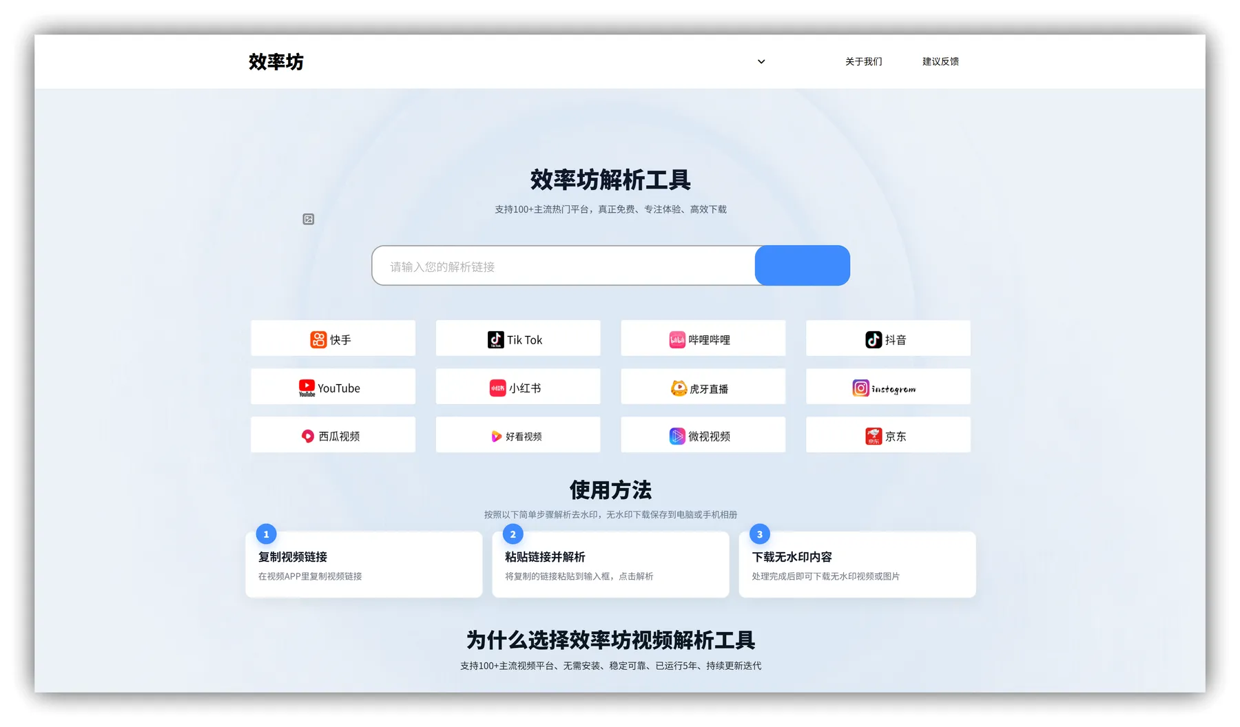 简介:支持下载抖音、B 站、YouTube、TikTok 等上千个平台站点的视频图片,支持一键解析即可免费去除水印,快速将高清无水印视频图片保存至电脑或手机。