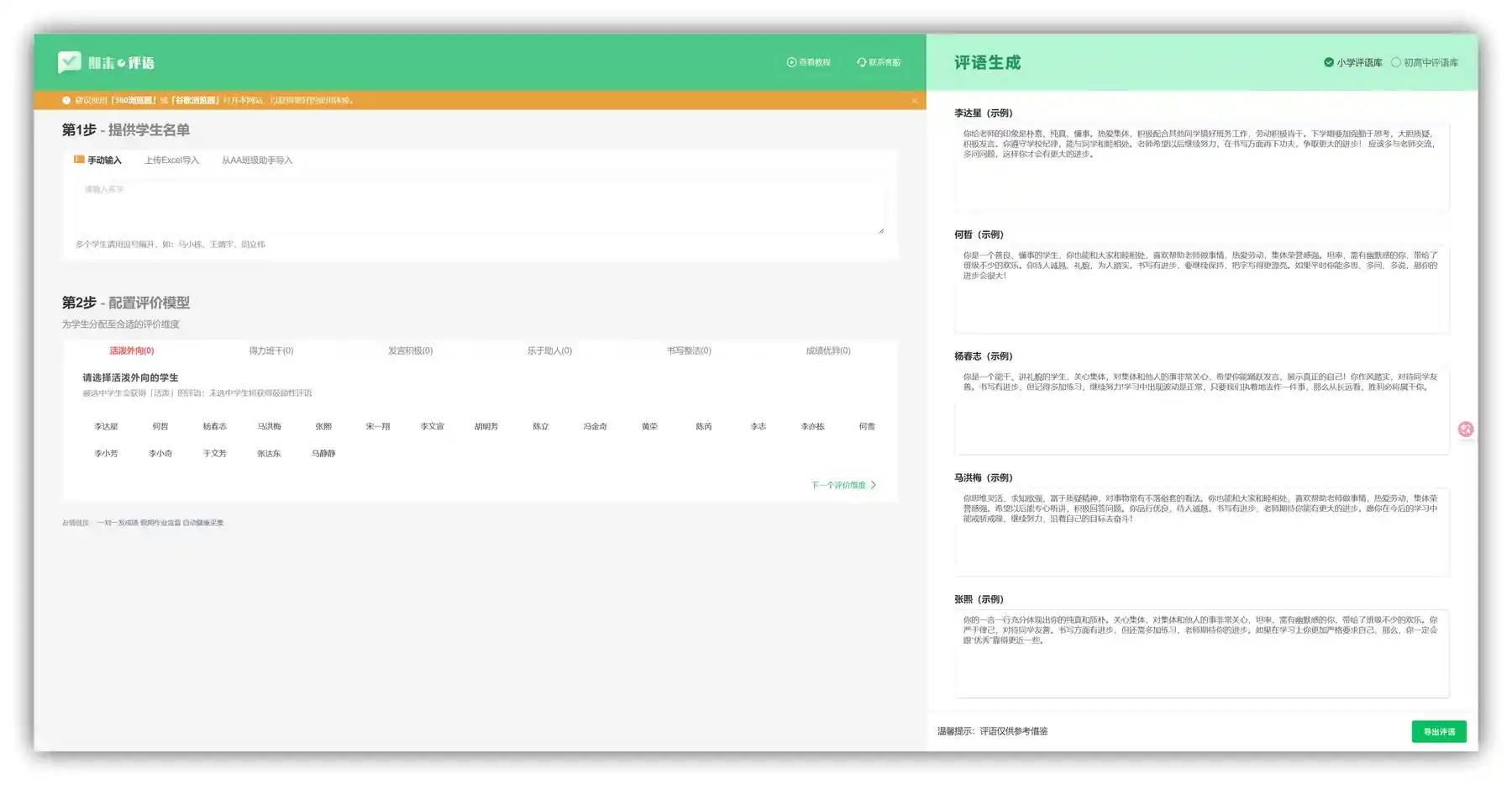 简介:一个专门批量生成不同学生的评语,支持通过excel批量导入学生姓名。还可以根据不同的学生,有针对性的调整评语,真的能省很多精力!