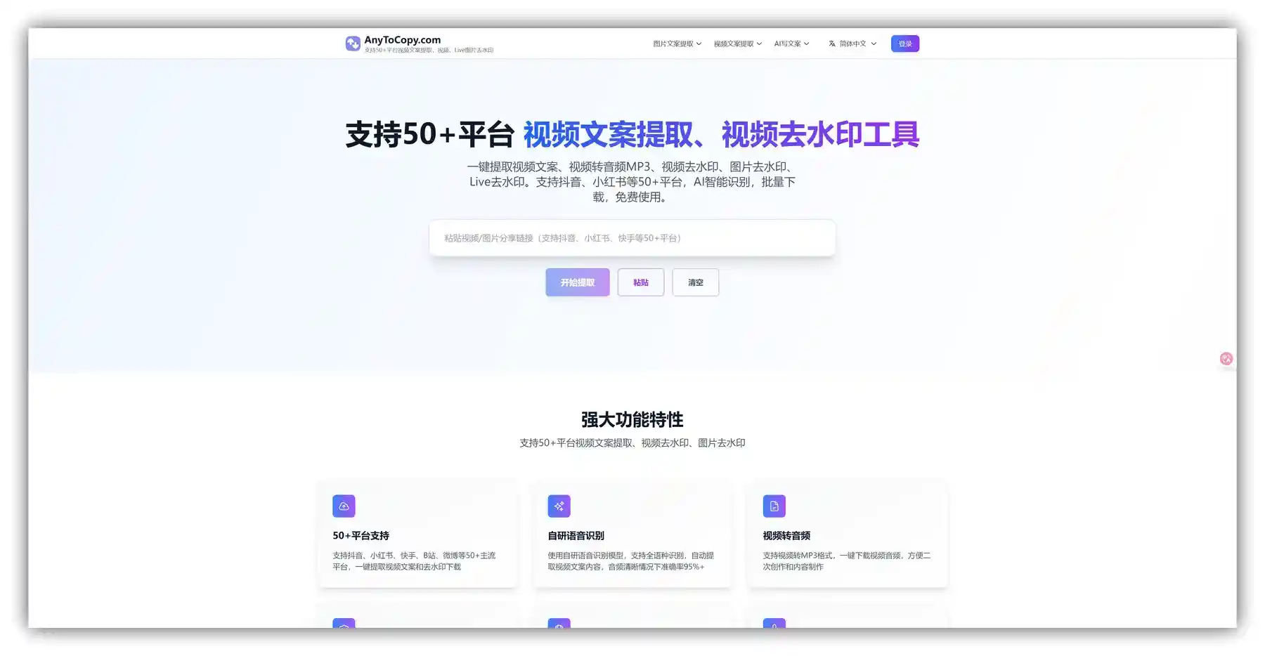 简介:一键提取视频文案、视频转音频MP3、视频去水印、图片去水印、Live去水印,支持抖音、小红书等50+平台,AI智能识别,批量下载,免费使用。
