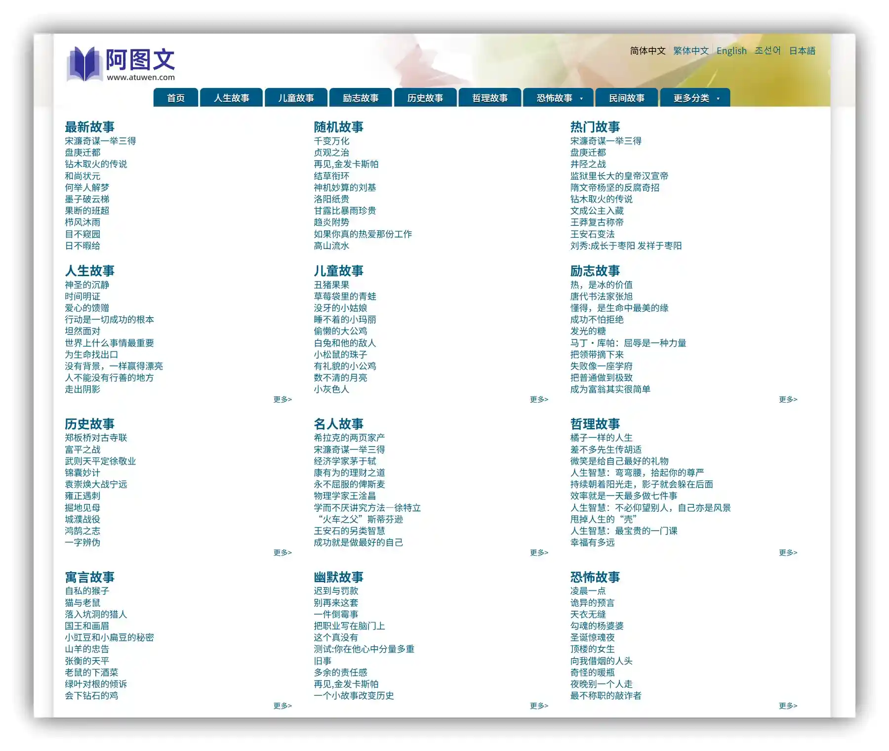 简介:一个精选故事网站,致力于为用户提供丰富、优质的故事内容。网站涵盖了人生故事、励志故事、儿童故事、历史故事、哲理故事、恐怖故事、职场故事、名人故事、寓言故事、幽默故事、成语故事、民间故事等多种类型,满足不同人群的阅读需求。阿图文旨在通过故事传递知识、启迪智慧、感悟人生。