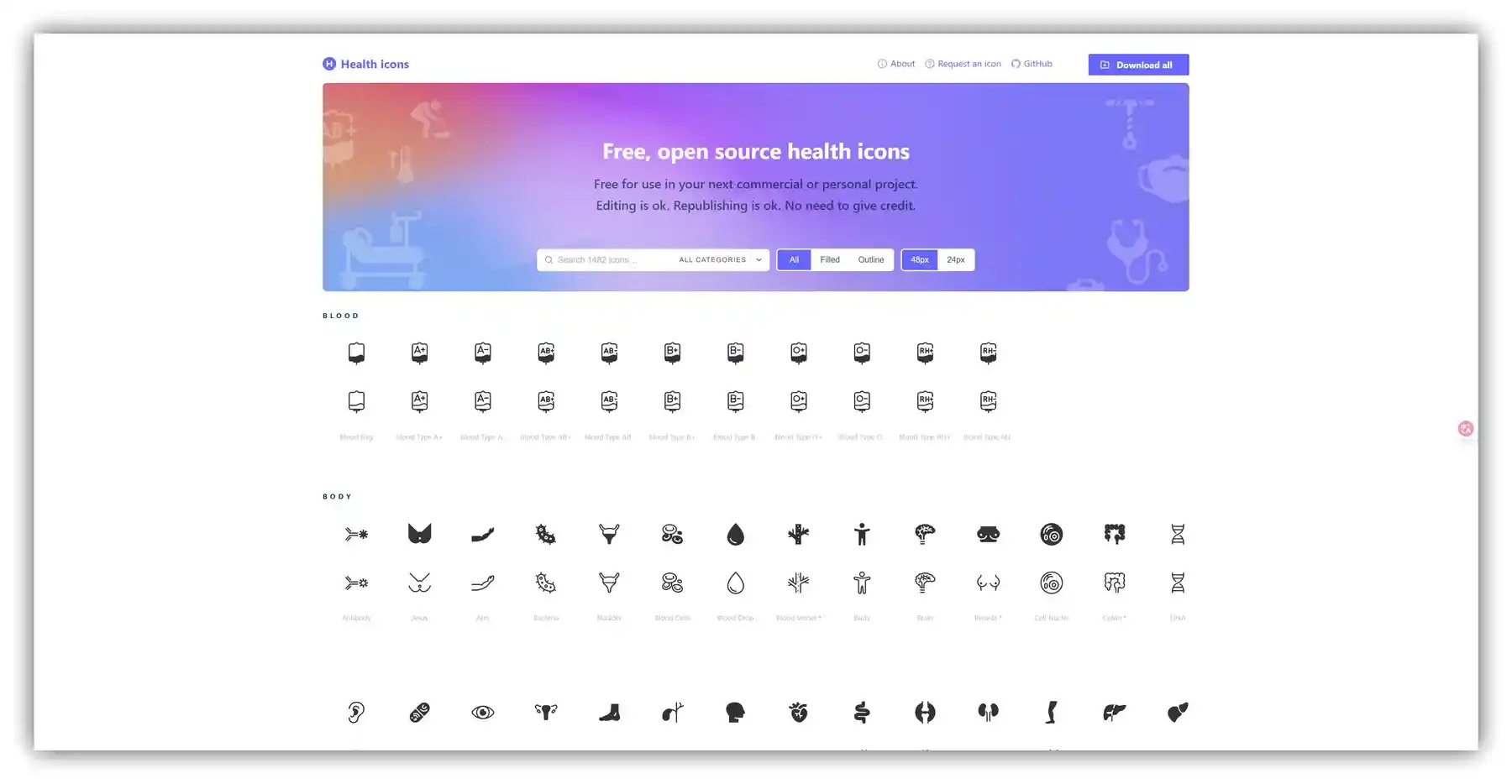 简介:免费开源的医疗健康矢量图标库,支持一次全部下载!目前有1482个图标,覆盖多类主题,支持商用或个人使用,可下载SVG和PNG格式。