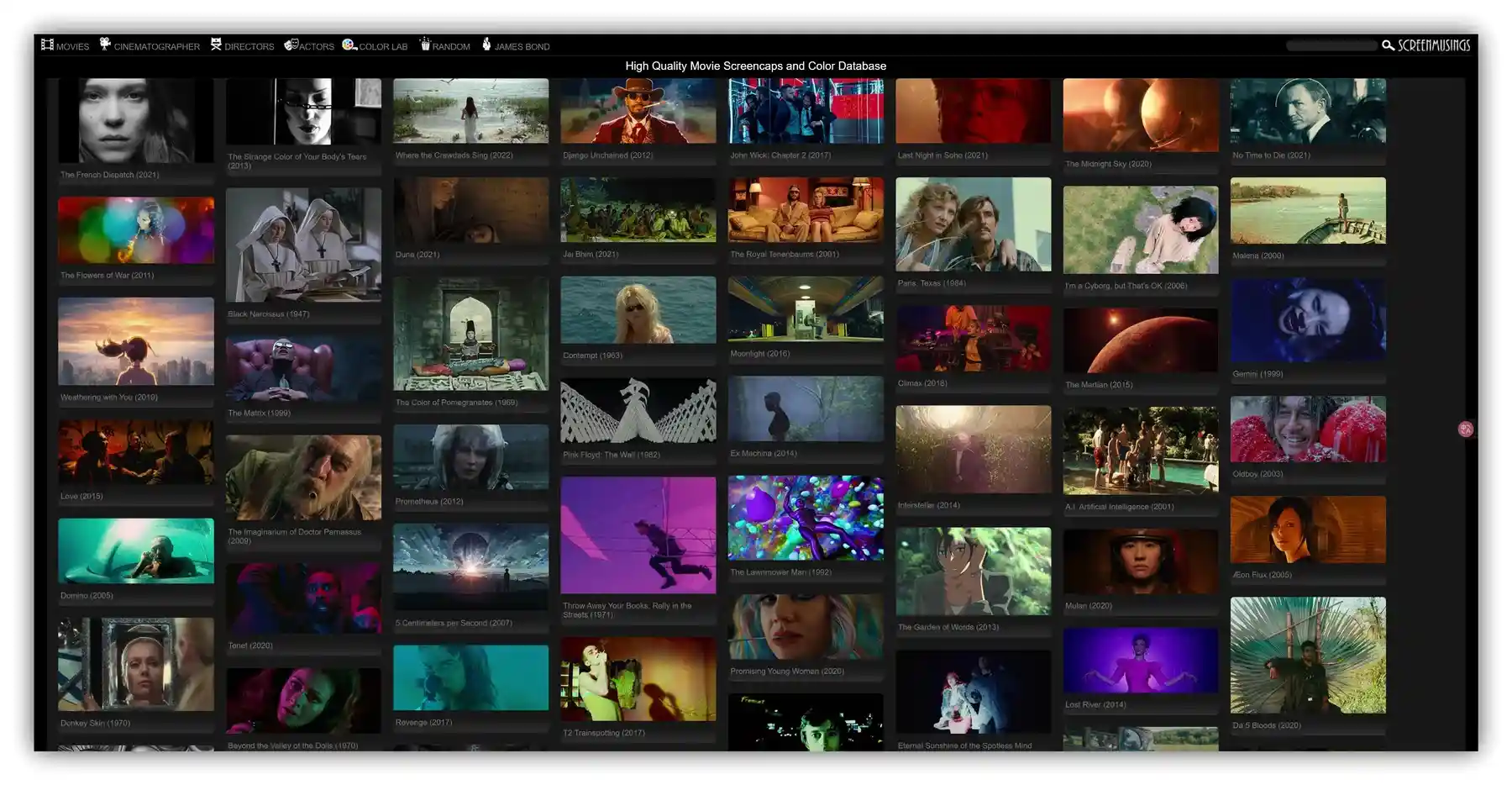 简介:里面有很多不错的电影截图,色彩、构图都选的比较好,可以按摄影师、导演、演员、年份、类型等进行查找。关键是,每一张截图的配色,它都会帮你列出来,还分不同色系!绝对是学习色彩和构图的好地方。