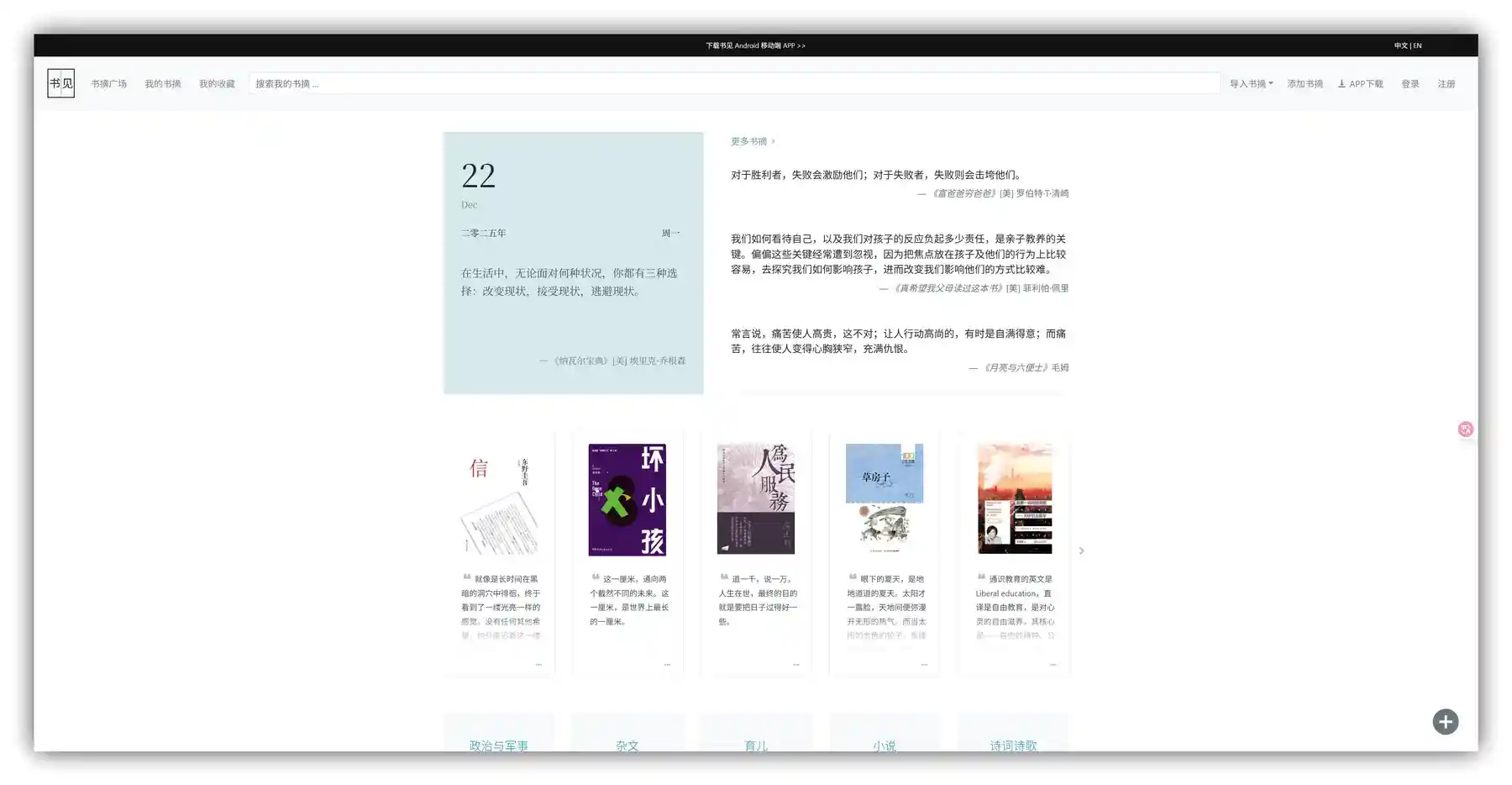 简介:记得初高中时经常会自备一个笔记本,摘抄书本或杂志中遇到的一些好句子、段落,也会做一些剪报之类的贴在笔记本里。看到这个网站,感觉就很亲切。这些书摘都是来自于各本名著或畅销书中,虽然有点心灵鸡汤,但看着心情还是会美美的。