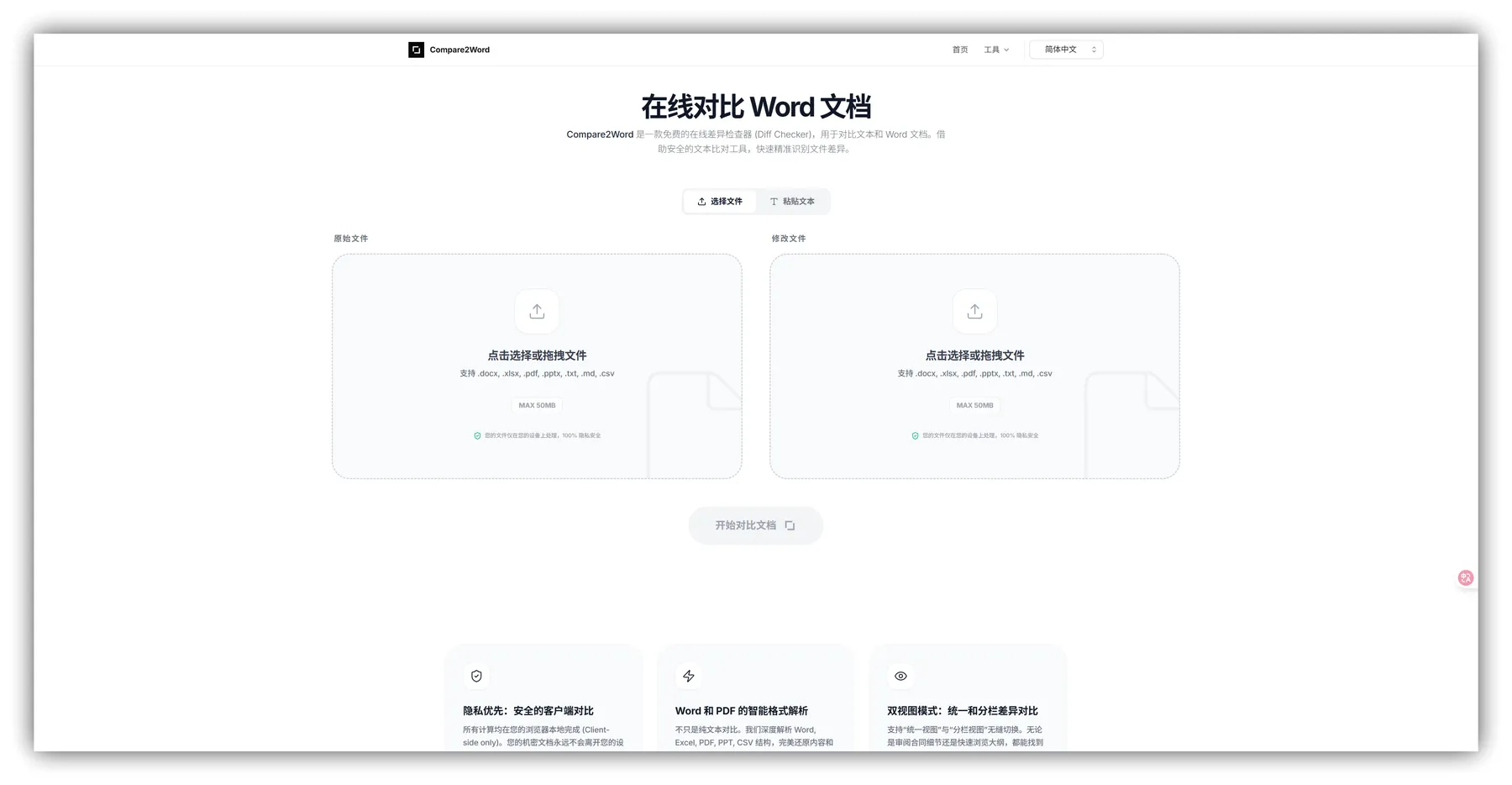 Compare2Word 是一款专注于 Microsoft Word 文档内容差异分析的在线工具,能够高效识别两份 .docx 文件之间的文字增删、格式变动及段落调整,并以直观方式高亮显示差异,适用于法律、学术、行政等对文本准确性要求较高的领域。