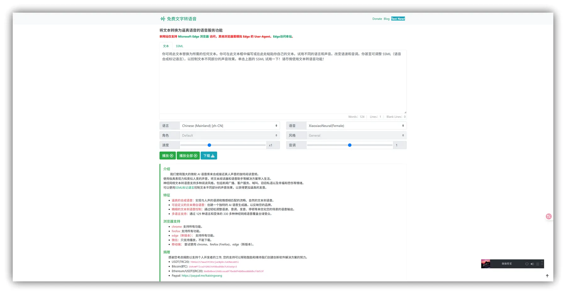 - 一键生成语音:输入文字后即时播放并支持下载。