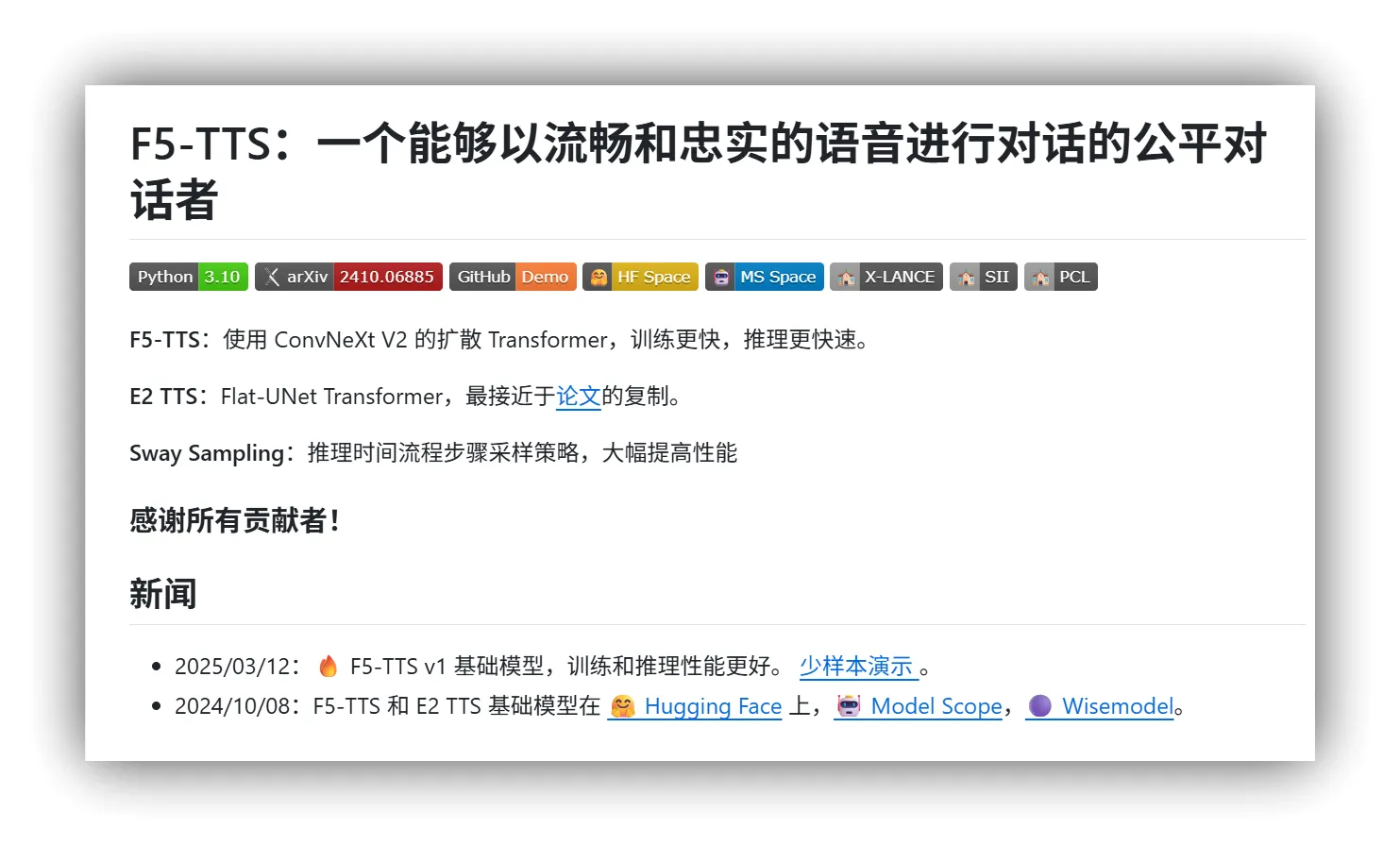 F5-TTS 是一个基于流匹配(Flow Matching)与对比学习的先进开源 TTS 模型,追求极致语音自然度与鲁棒性。