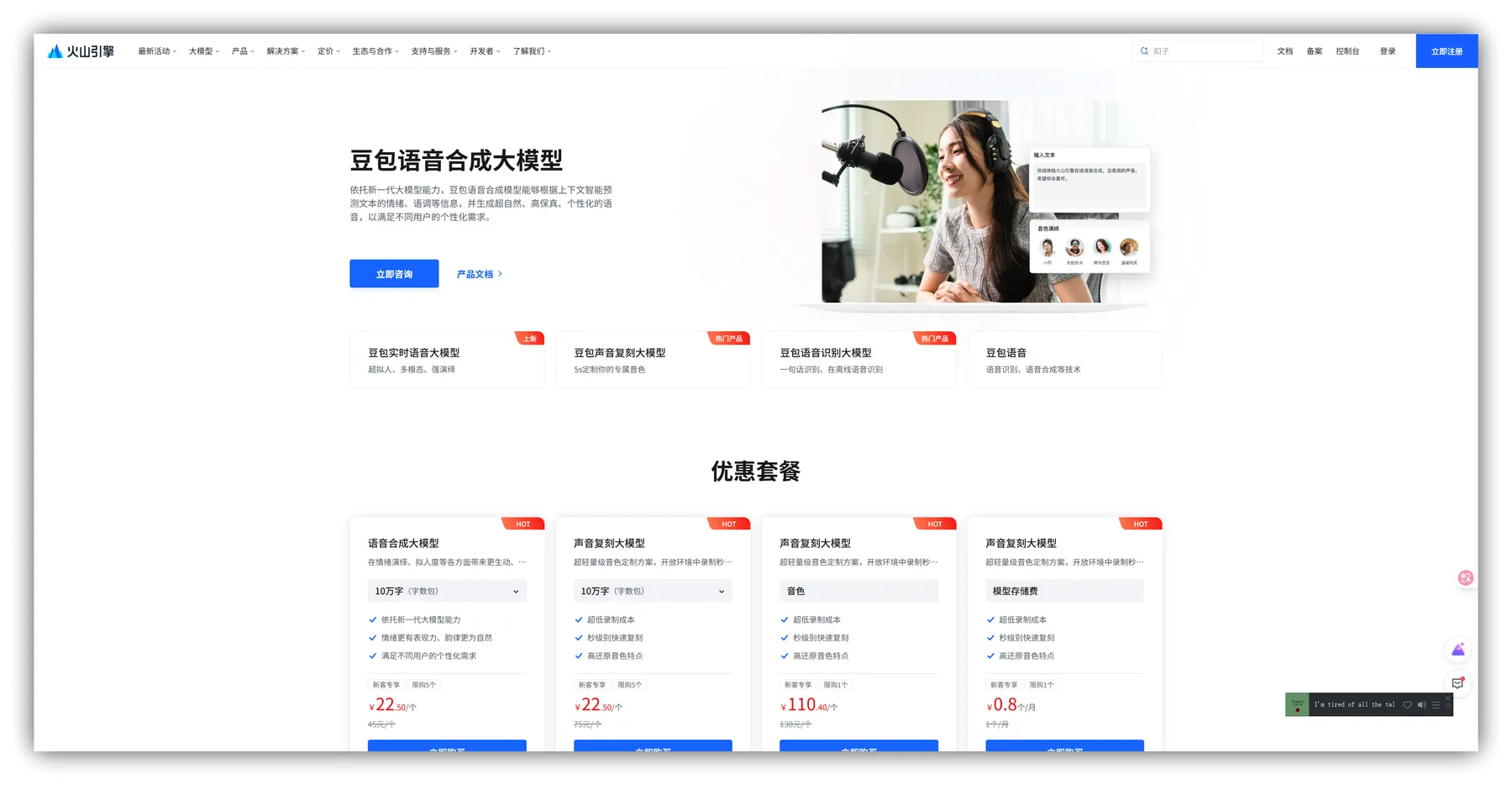 火山引擎 TTS 由字节跳动推出,结合其在短视频与直播领域的经验,提供高表现力、低延迟的语音合成服务。